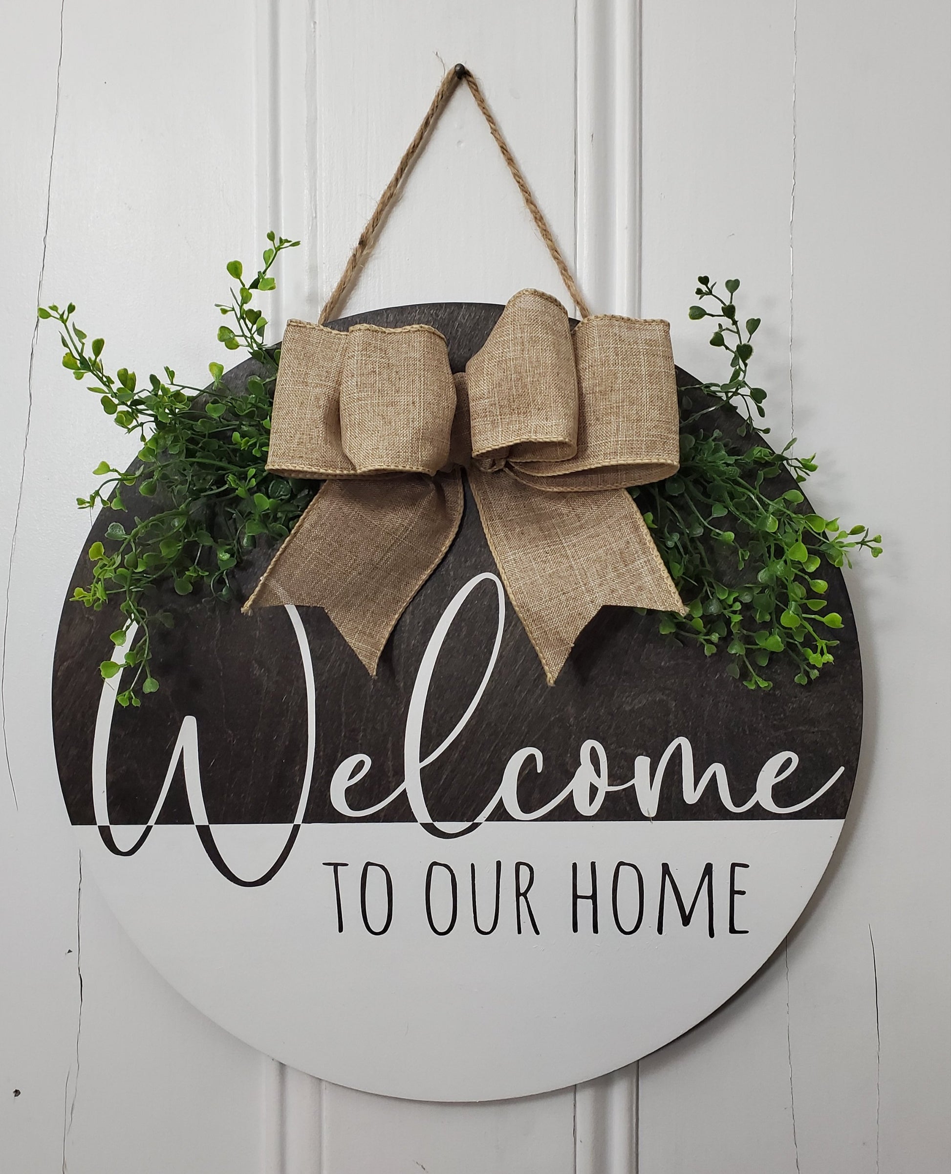 Introducing our "14" Welcome to our home-Ebony" door hanger, specially crafted to add a warm touch to your entrance. This beautifully painted and sealed door hanger is designed to withstand outdoor weather conditions, ensuring long-lasting durability. Welcome your guests with style and elegance using this unique and inviting addition to your home decor.