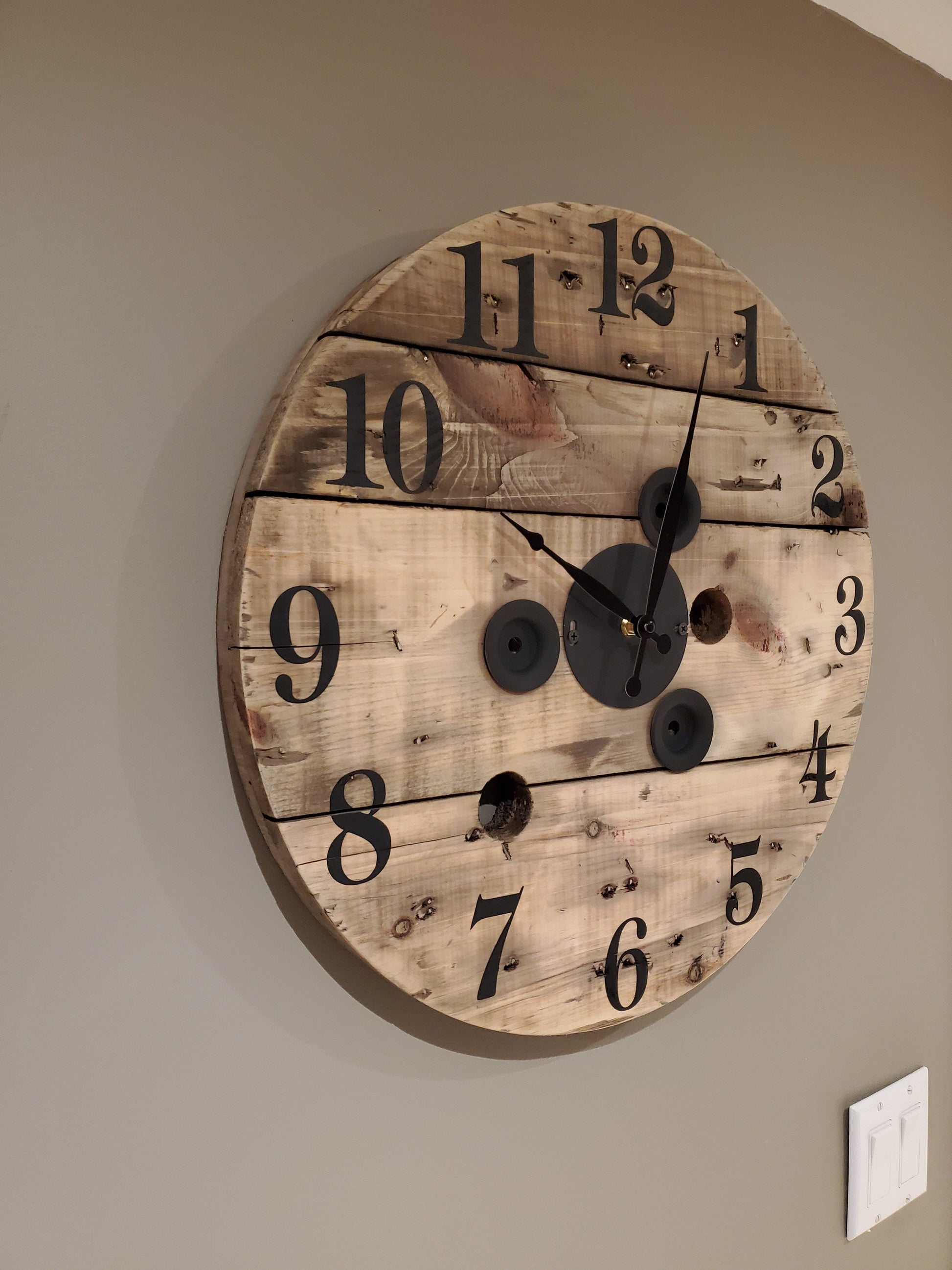 20" Rustic Spool clock - Natural light brown. Numbers are painted. Sawtooth hanger on the back.