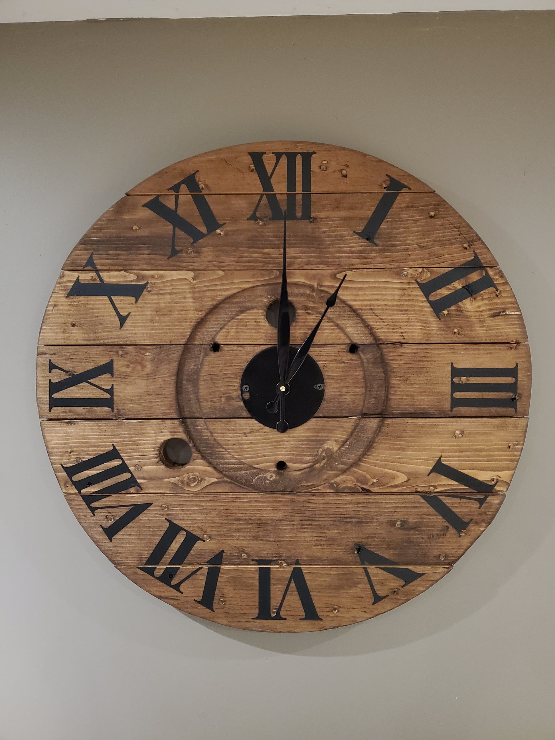 Add a touch of whimsy to your home with our 23.5" Spool clock. The painted roman numerals and stained provincial give it a playful yet elegant look. Comes with a sawtooth hanger for easy hanging. (Time may fly, but this clock will keep you on schedule!)