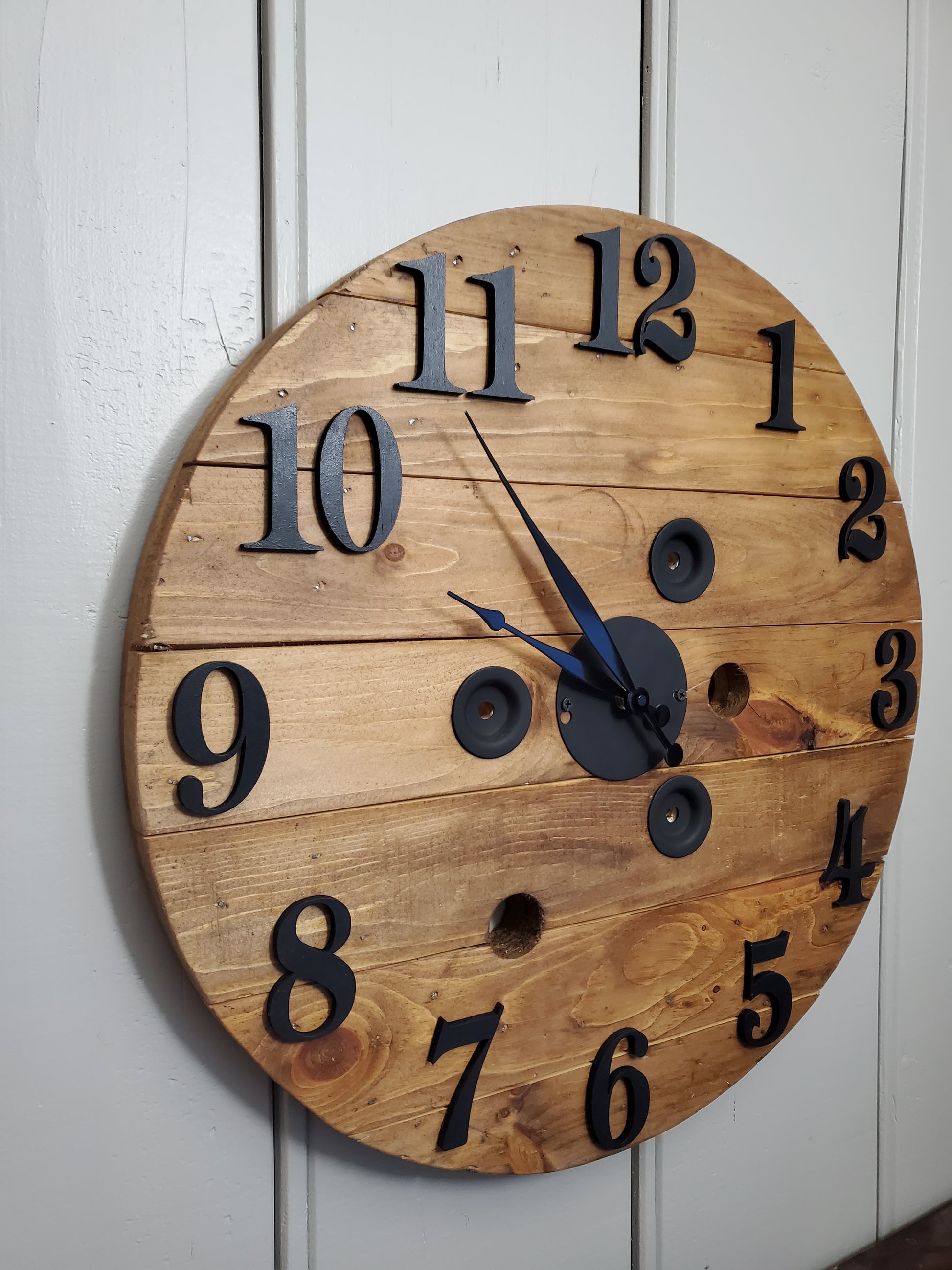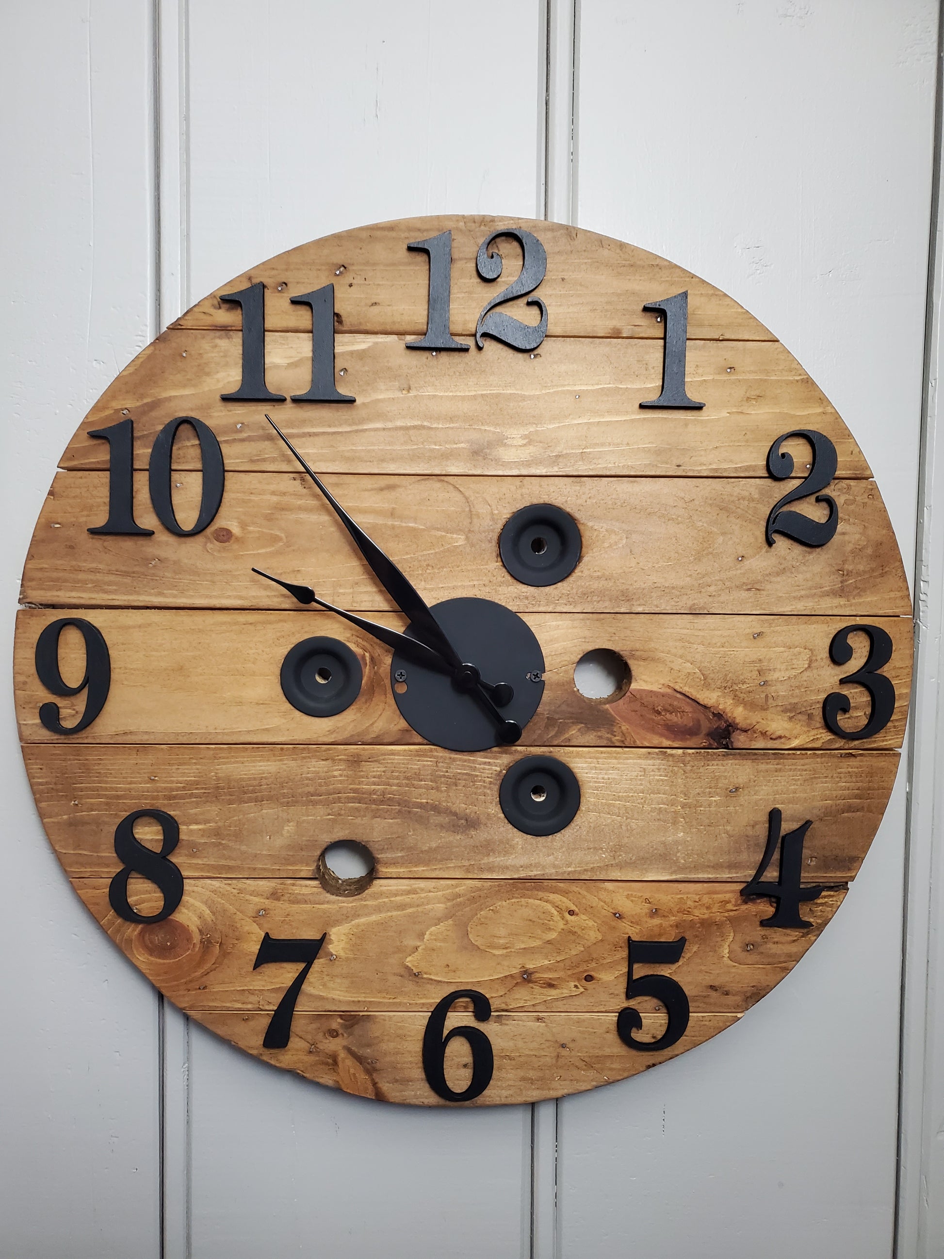 Add a touch of charm to any room with our 23" 3D Spool clock in stained golden oak. The unique 3D wood numbers and sawtooth hanger make for effortless hanging. Time never looked so good!"