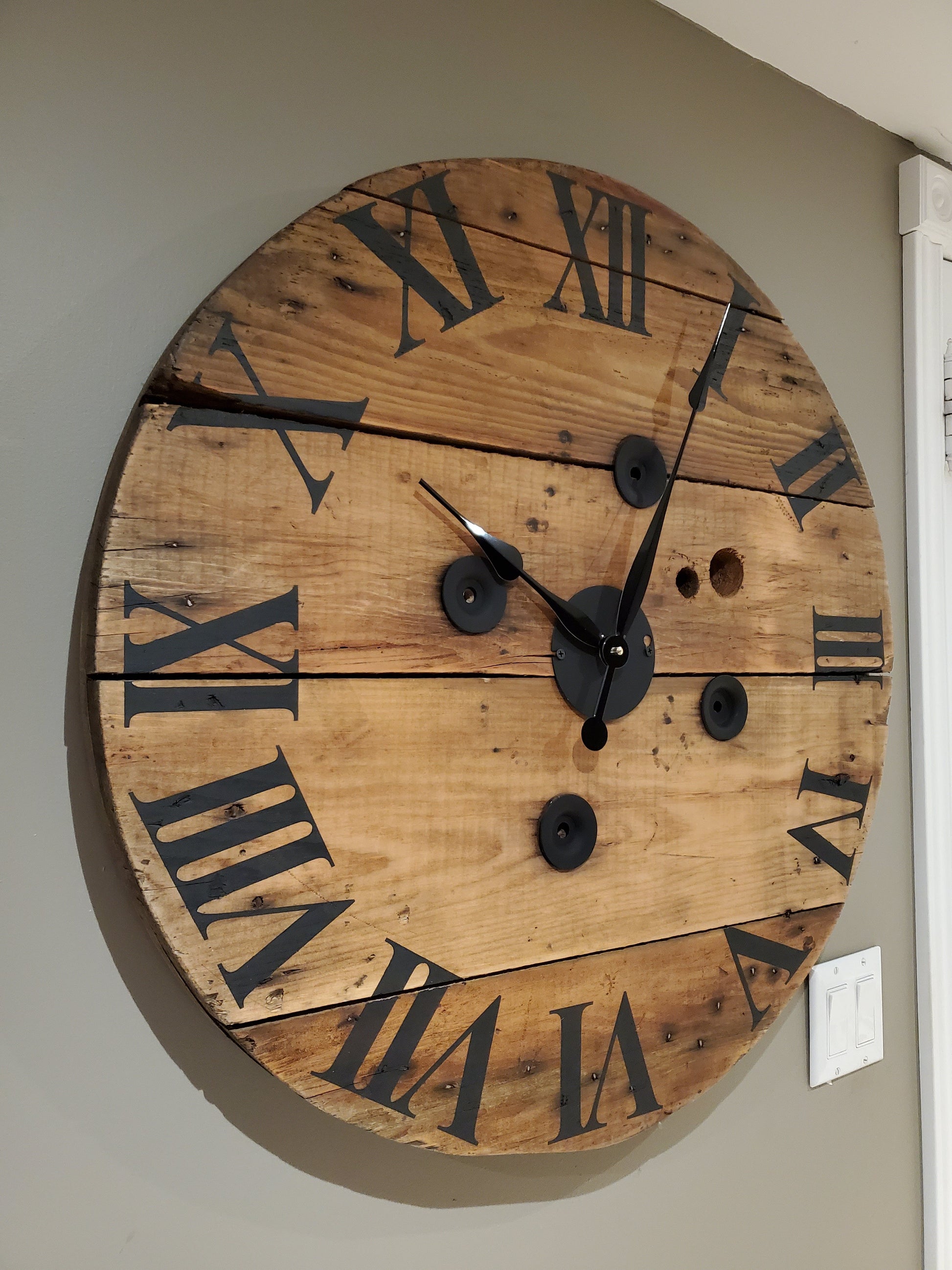 30" Spool Clock, Stained Ipswich - Painted numbers. Heavy duty sawtooth hanger on the back.