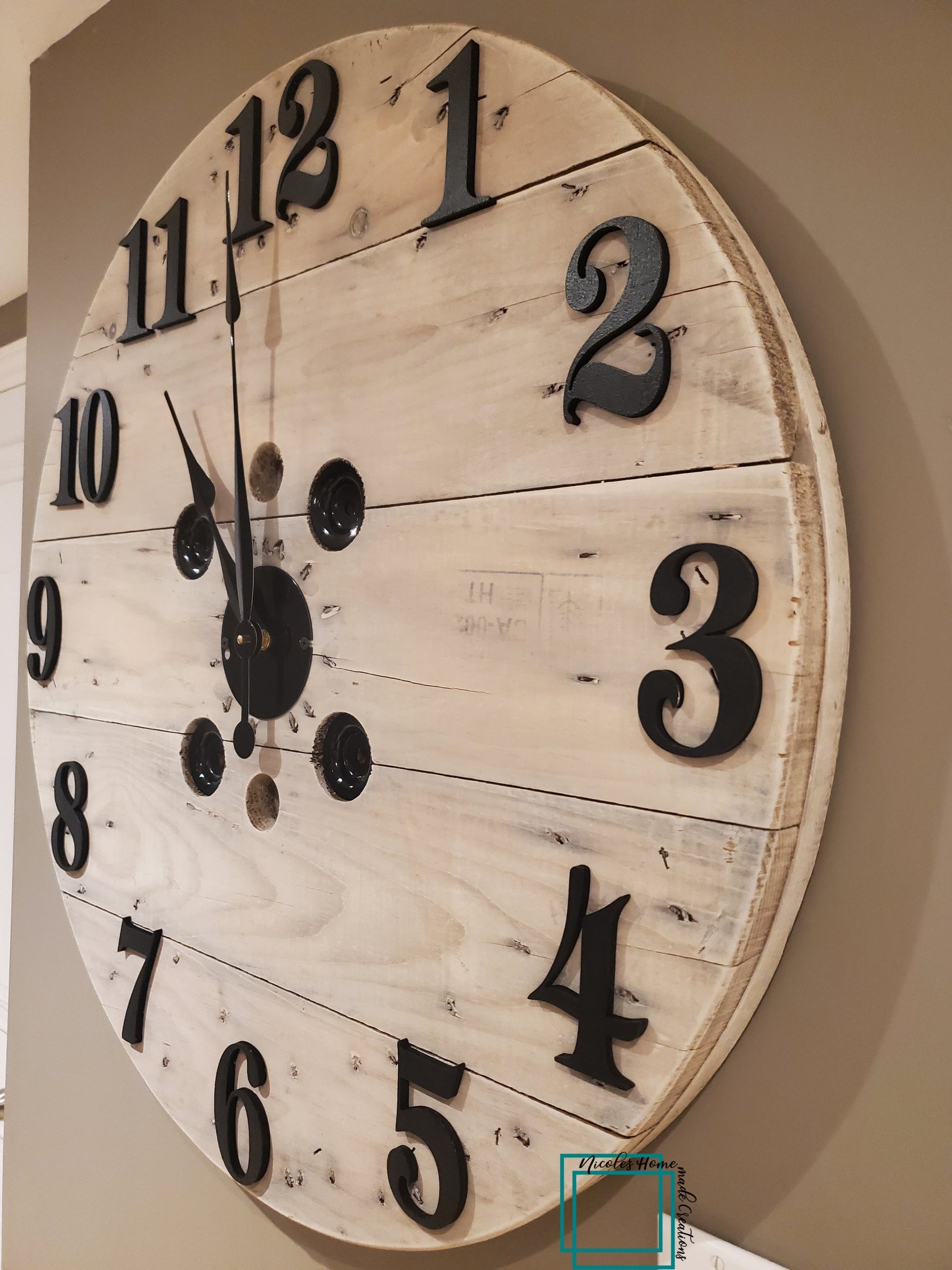 The 30" Spool clock features eye-catching 3D wood numbers, adding a rustic touch to any space. It comes in a white washed finish, exuding elegance. With its heavy duty sawtooth hanger, this clock is easy to hang on the wall. Perfect for adding style and functionality to your home or office, it is a must-have decor item.