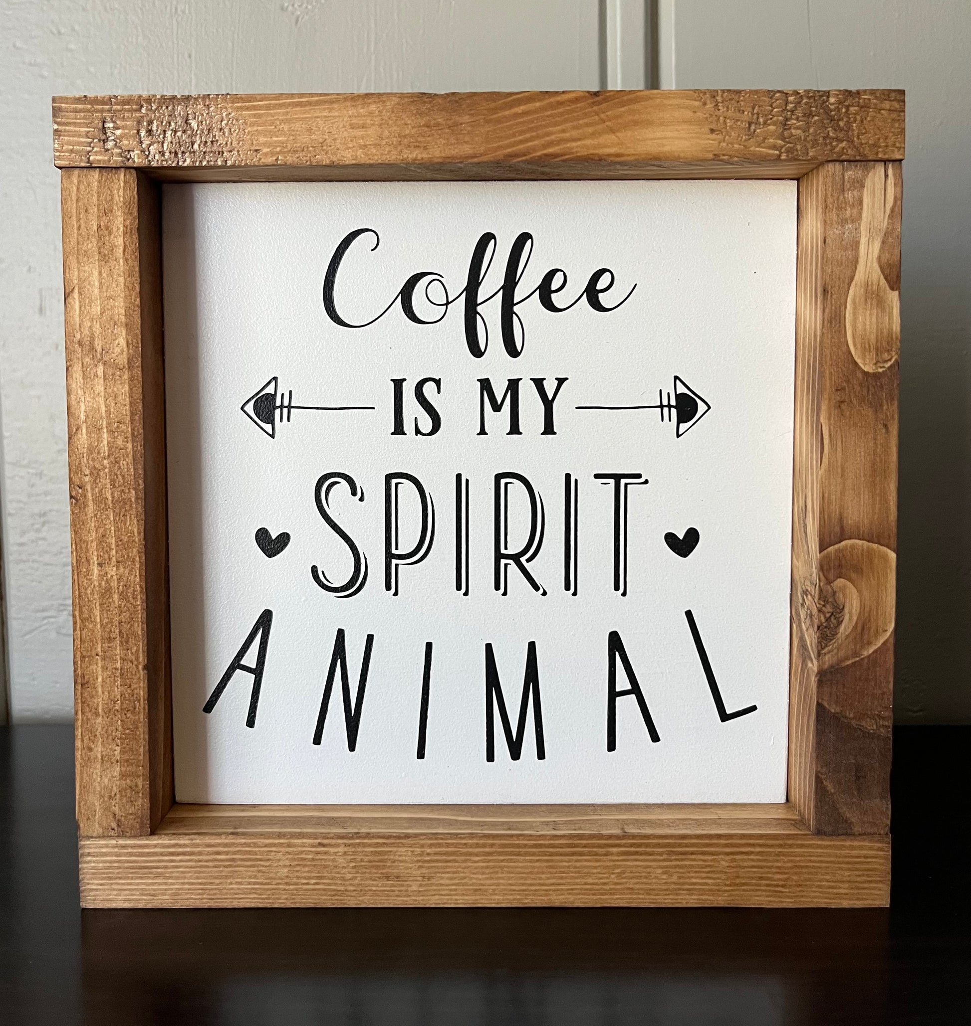 "Embrace your love for coffee with this 8x8" wooden sign. Stained wood sign. this features the playful phrase "Coffee is my spirit animal" and comes with a convenient sawtooth hanger on the back. Perfect for any coffee lover's home or office decor."
