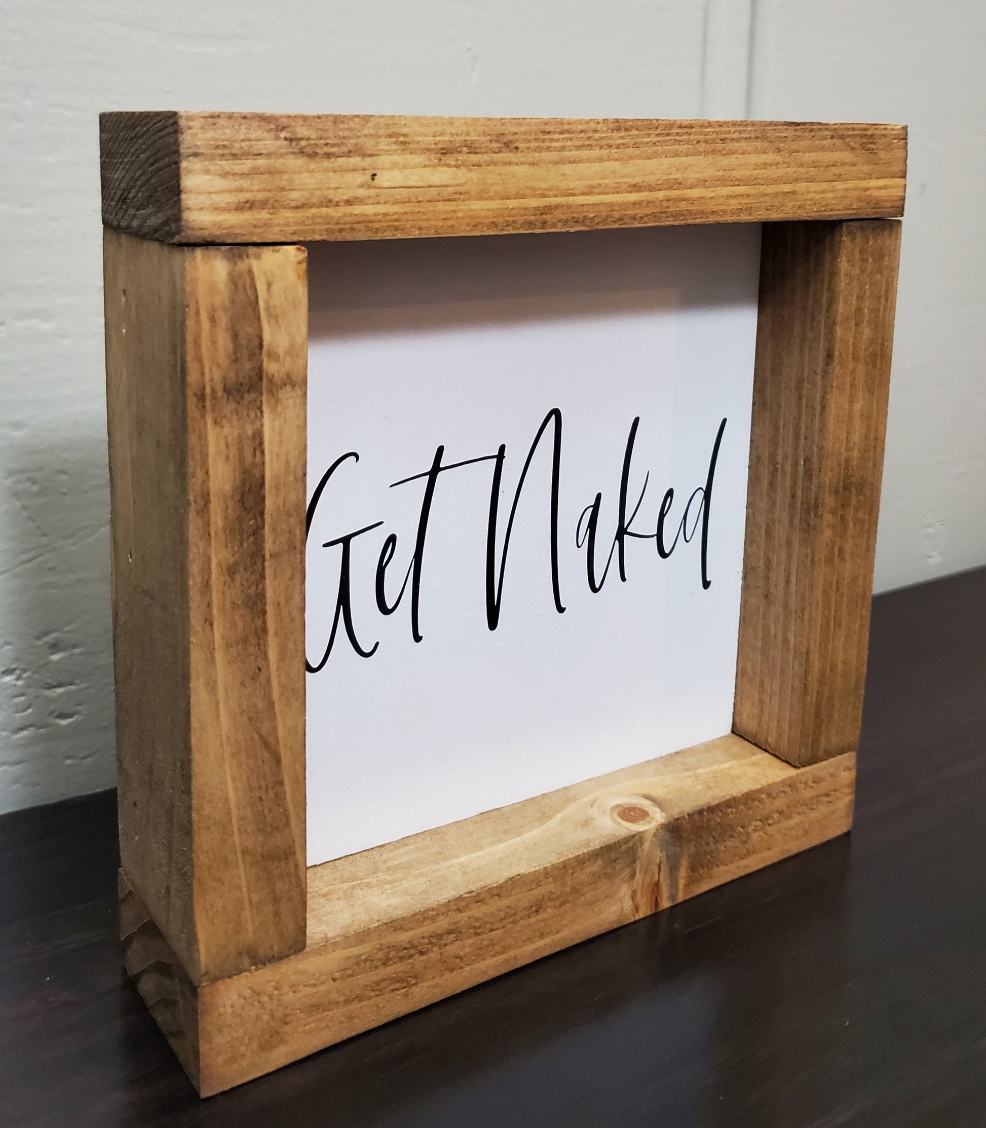Highlight your bathroom's playful side with this 6 x 6" Get Naked sign. Stained special walnut. Made from durable materials, it's perfect for adding a fun touch to your decor. Let your guests know you have a sense of humor while also keeping your bathroom stylish and on-trend.