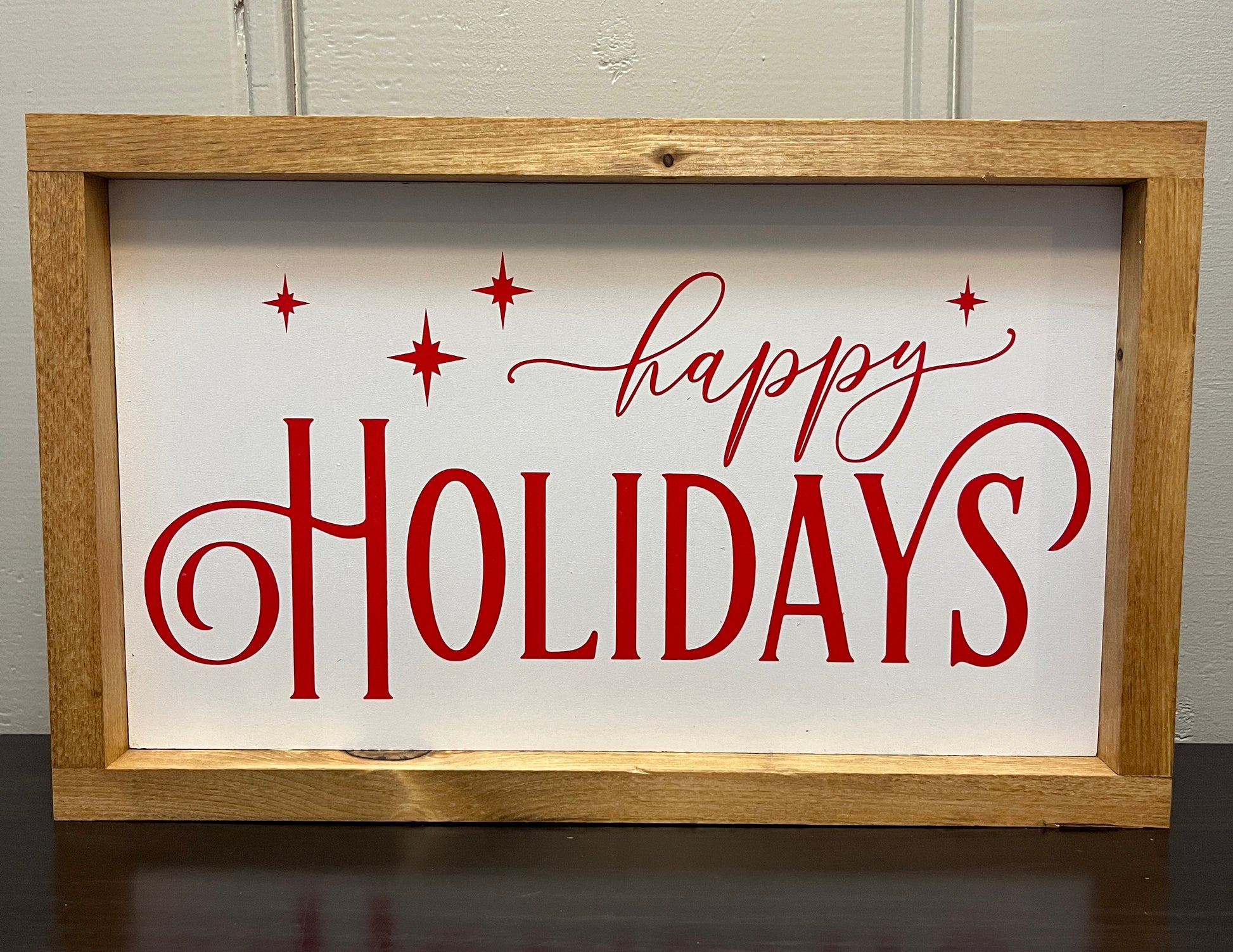 Experience the joy of Christmas with this beautifully crafted Happy Holidays measuring 15.5" x 9.5". The stunning wood is stained with an elegant early American finish and includes a convenient sawtooth hanger on the back.