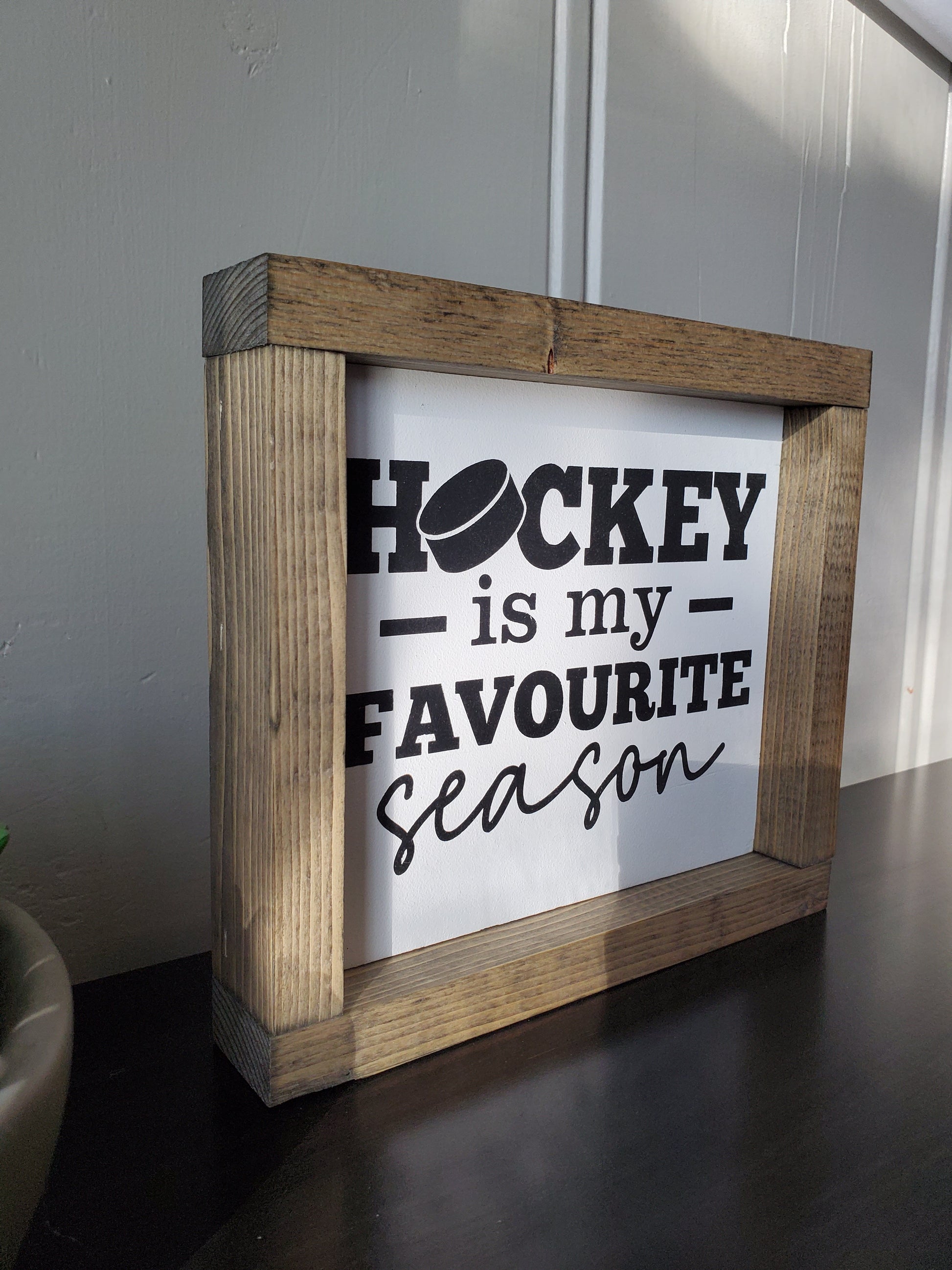 Hockey is my favourite season -stained classic gray. Sign is 8.5" x 8.5" x 1"