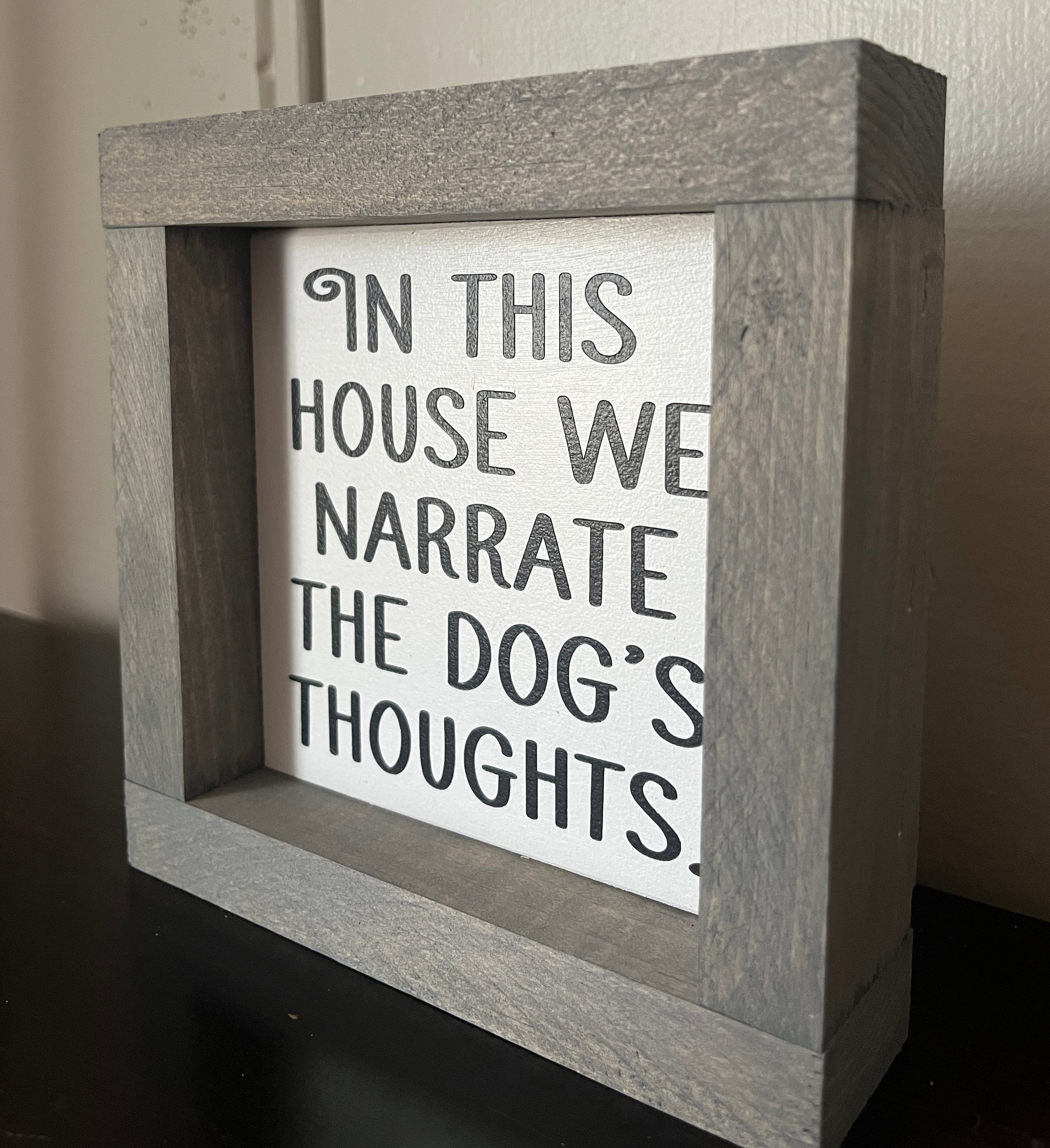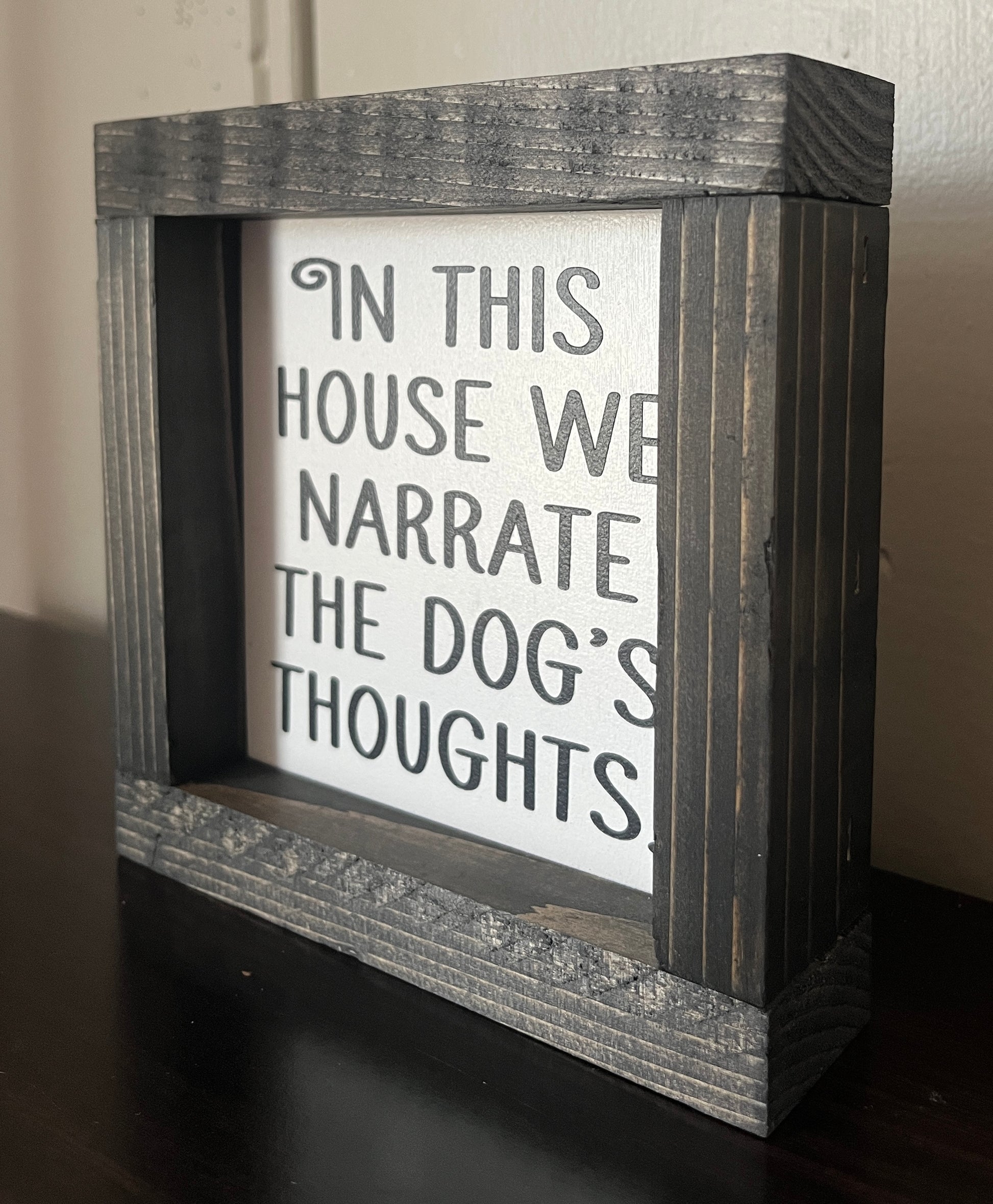 Constructed with love from Early American or provincial wood and carefully stained by hand, this 6"x6" sign is the perfect addition to your home - where the dog's inner monologue is always shared (and it looks darn good too, thanks to the sawtooth hanger).