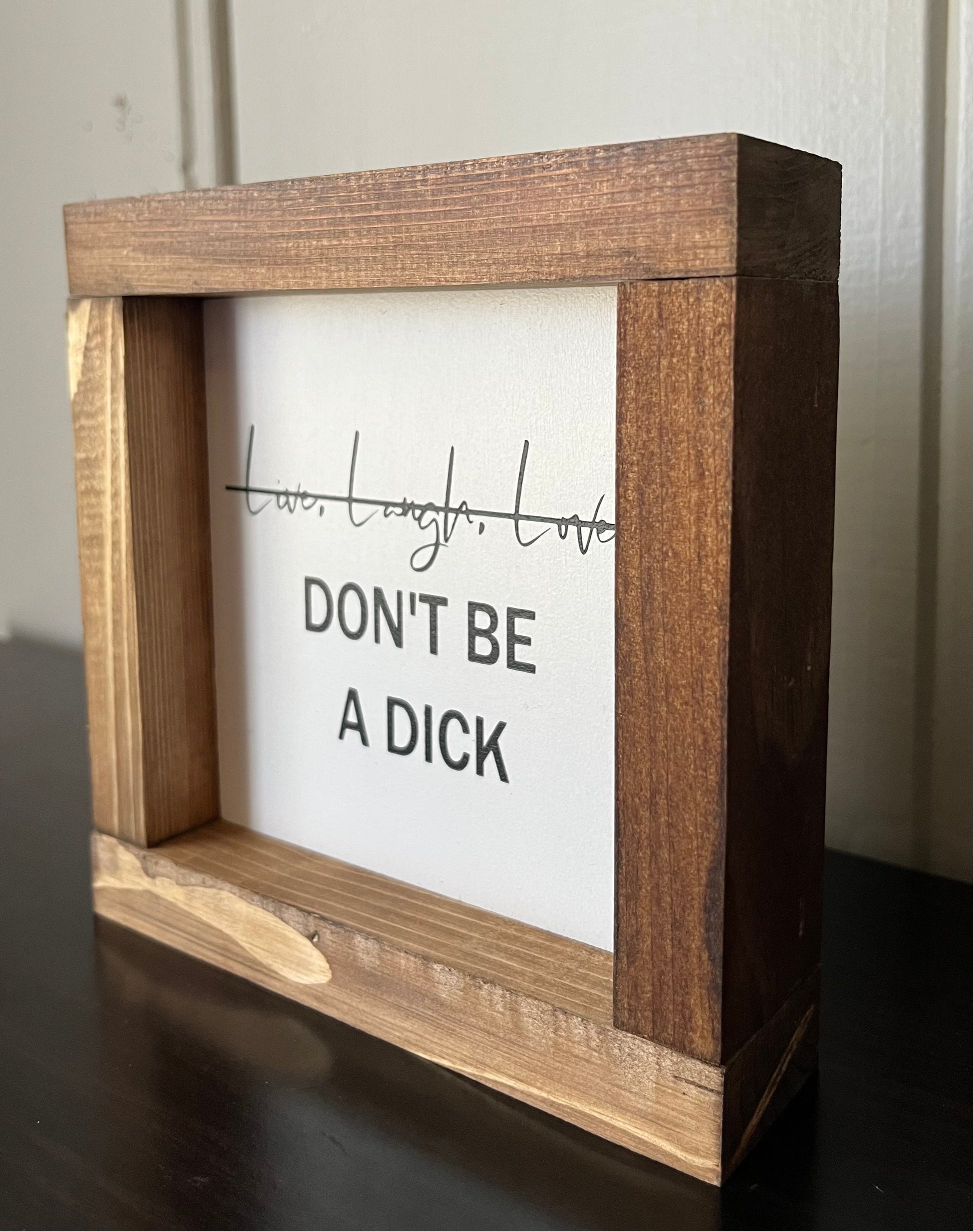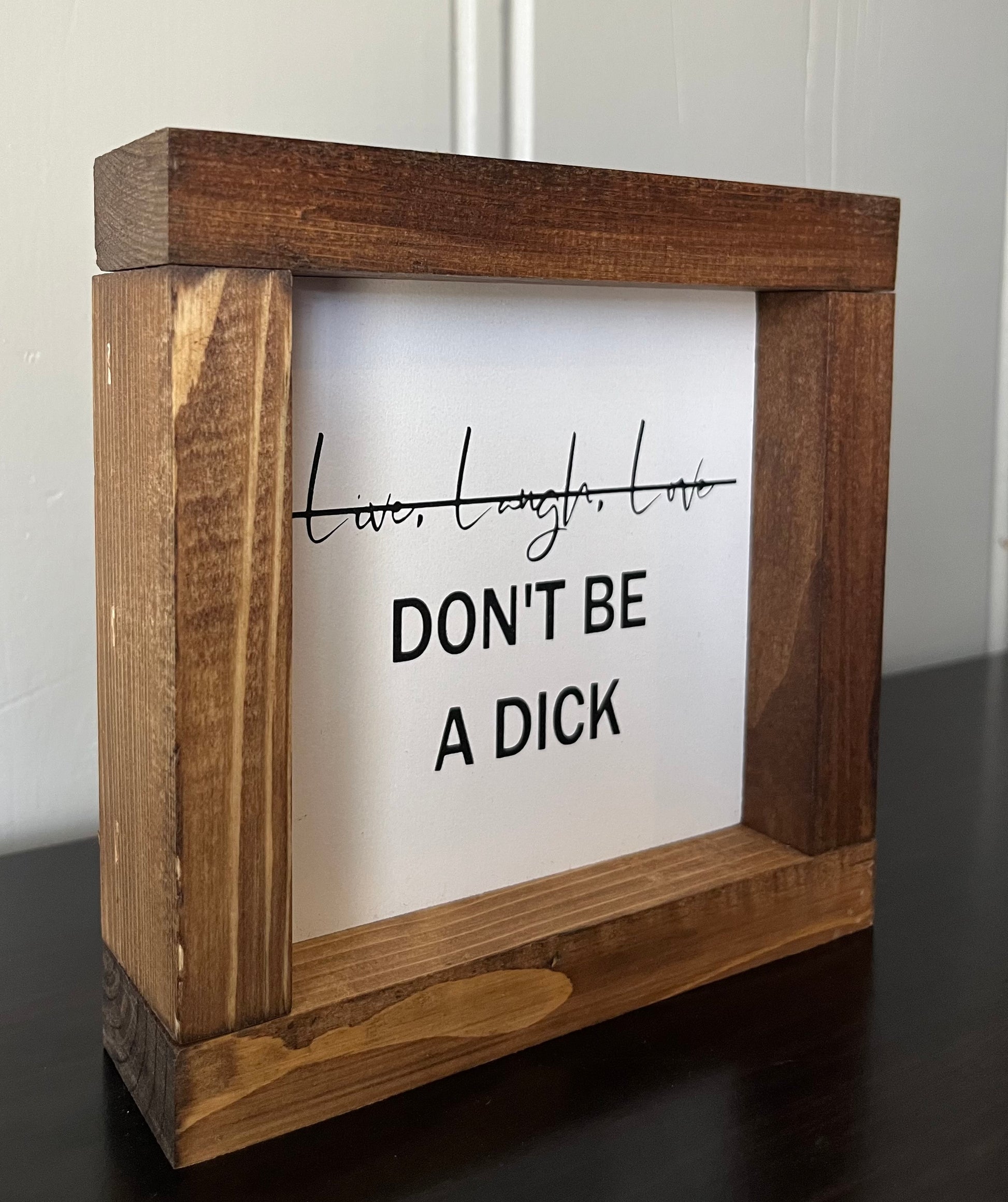 Spread love and laughter (but not being a dick) with our handmade 6" x 6" sign, stained in warm tones. Embrace a playful and quirky mindset while decorating your space with this reminder to live life to the fullest. No negativity allowed!