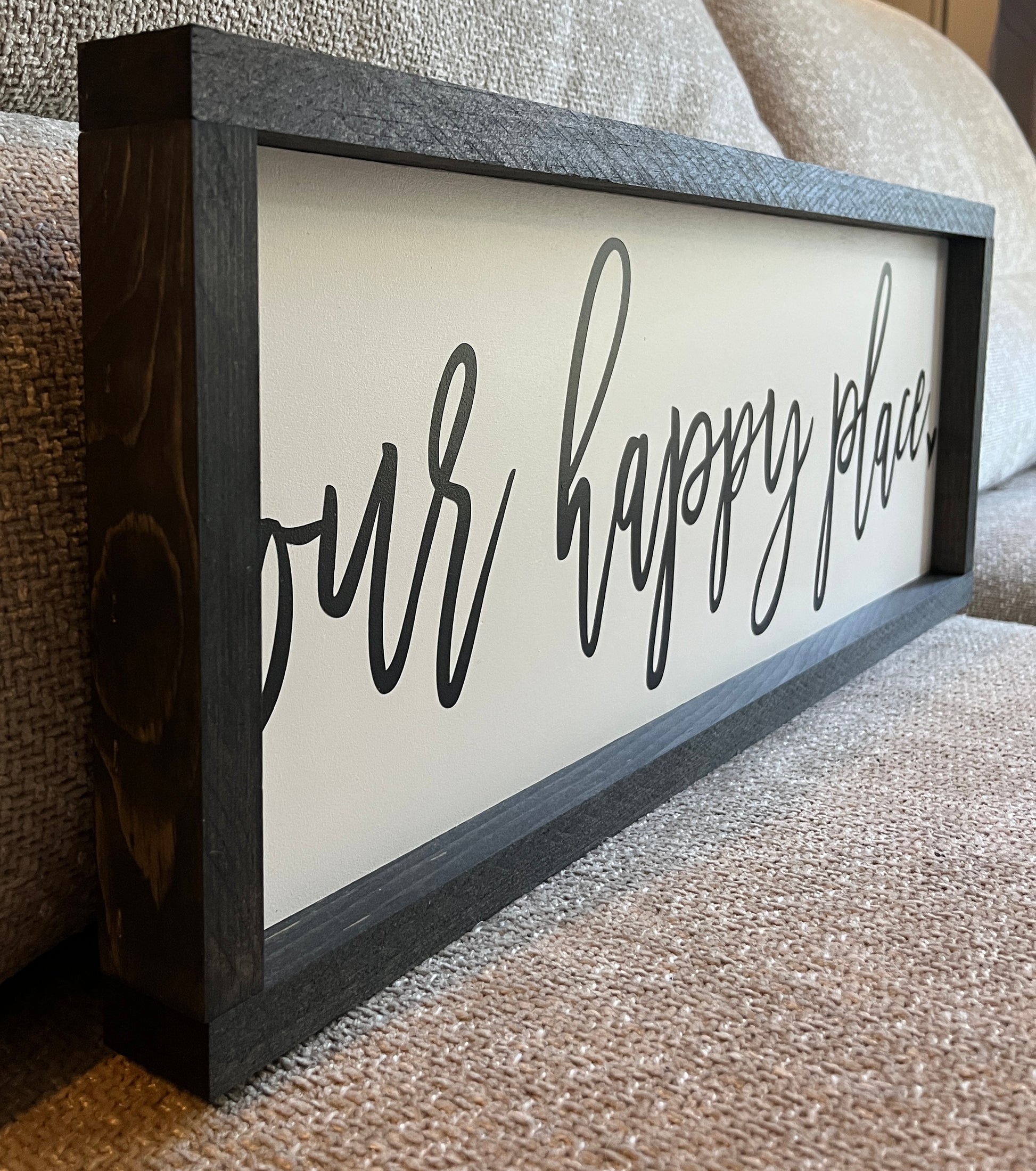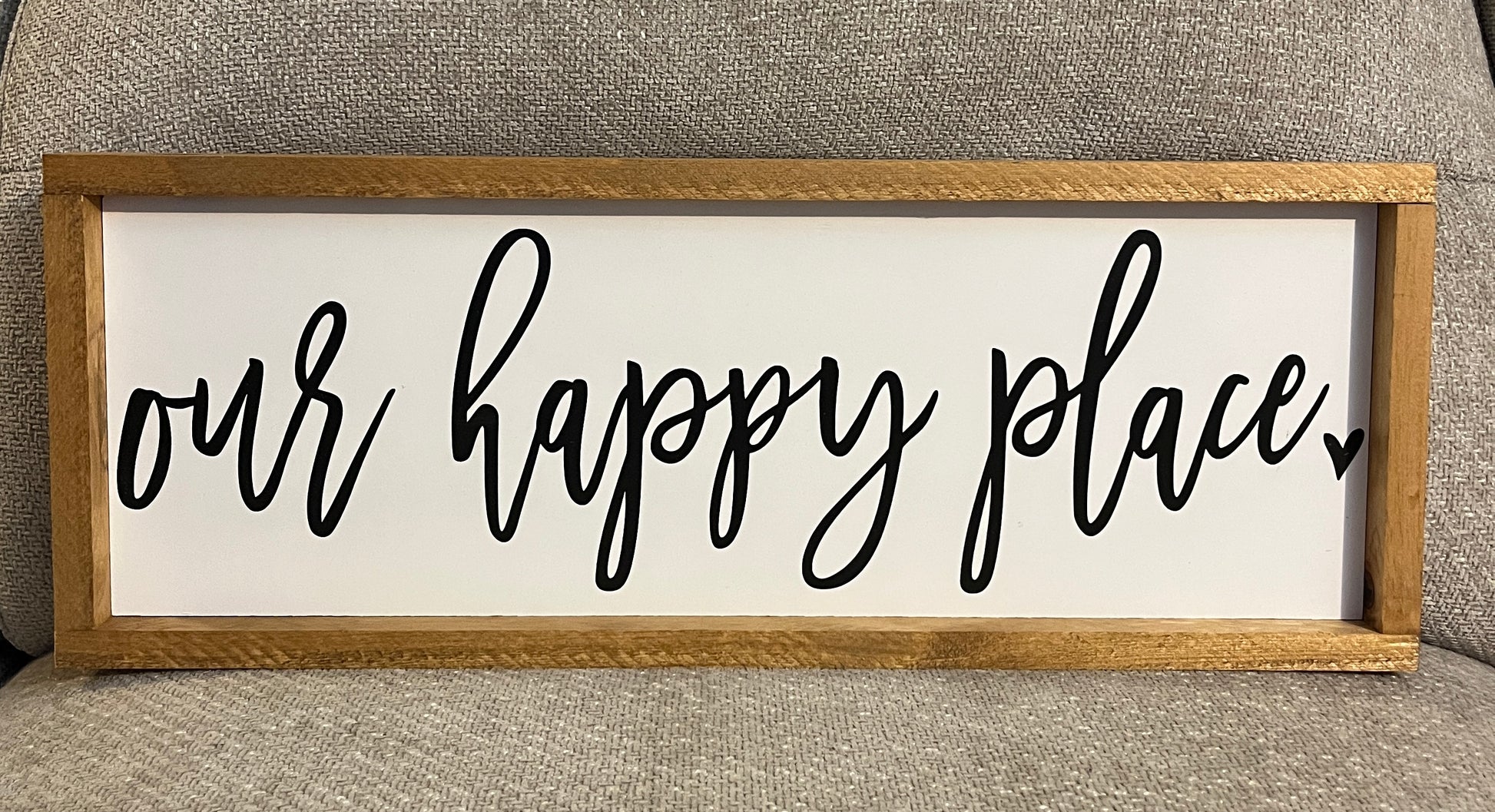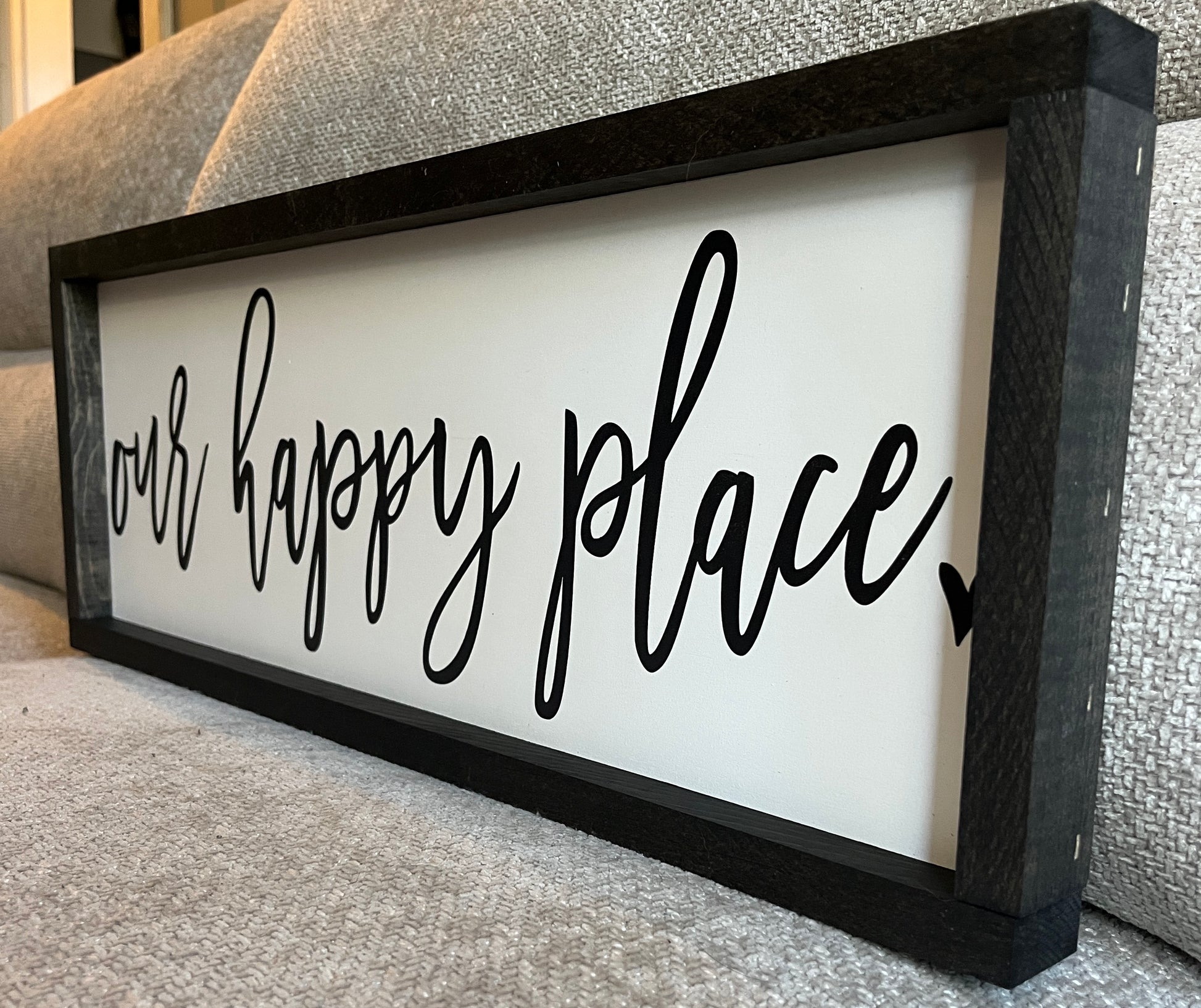 Add a touch of joy to any room with this 25.5" x 9.5" "Our happy place" sign. Featuring a convenient sawtooth hanger on the back, it’s easy to display your favorite spot where smiles happen. Perfect for creating a cheerful vibe in your home.