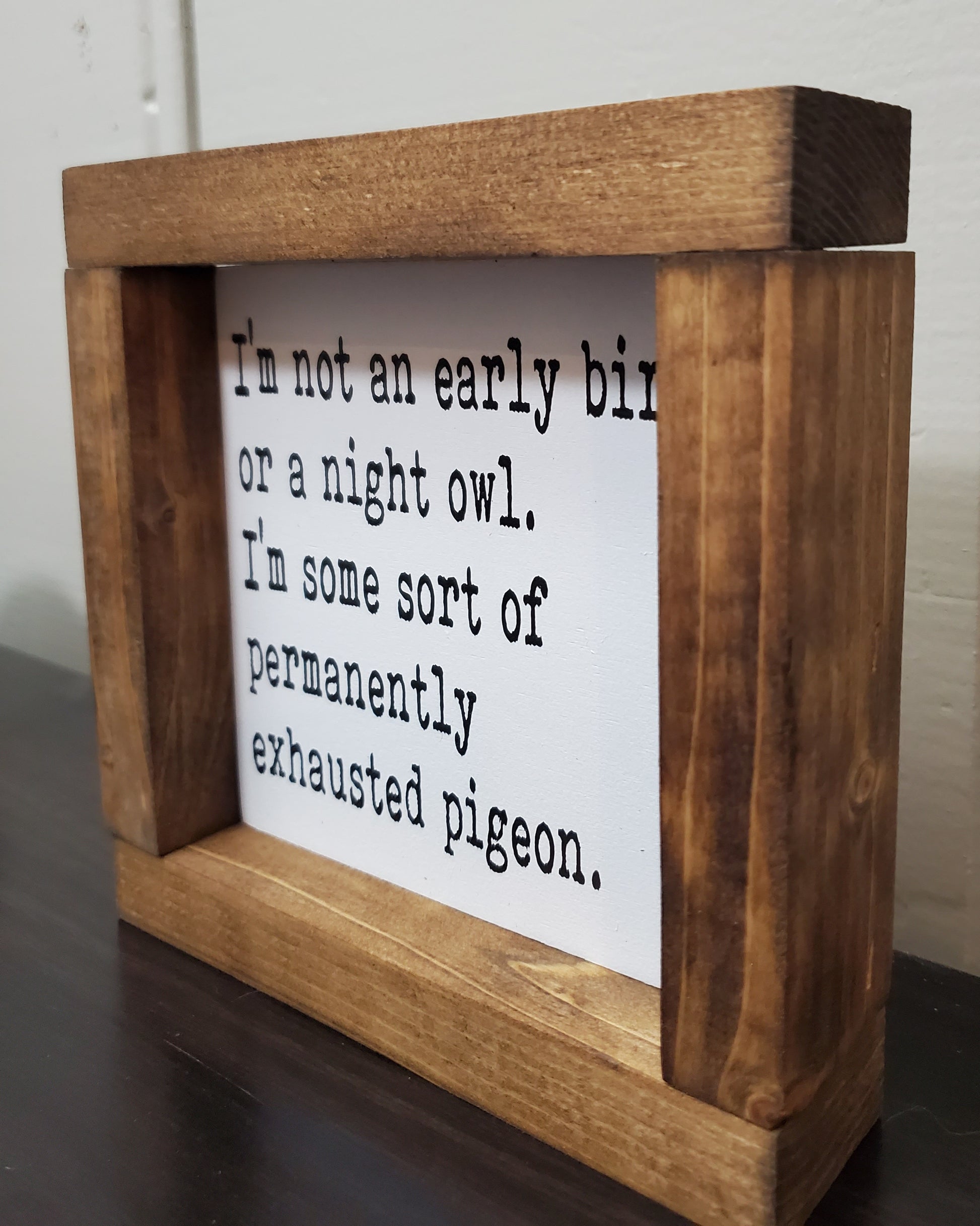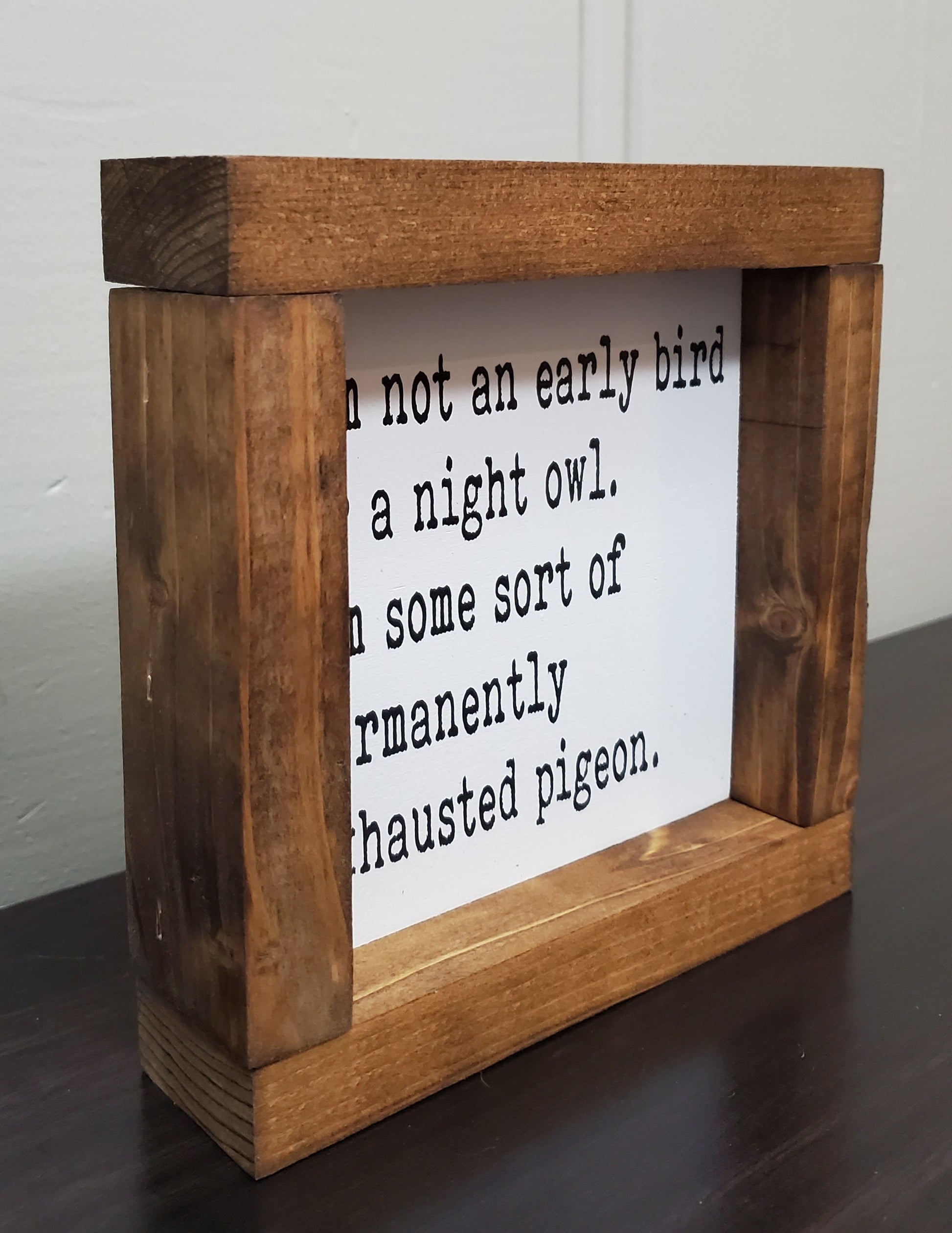 Elevate your decor game with this 6x 6" wooden sign that adds a touch of whimsy to any room. Featuring the cheeky phrase "I'm not an early bird", this rustic sign is stained in a provincial hue for a playful and unique touch.