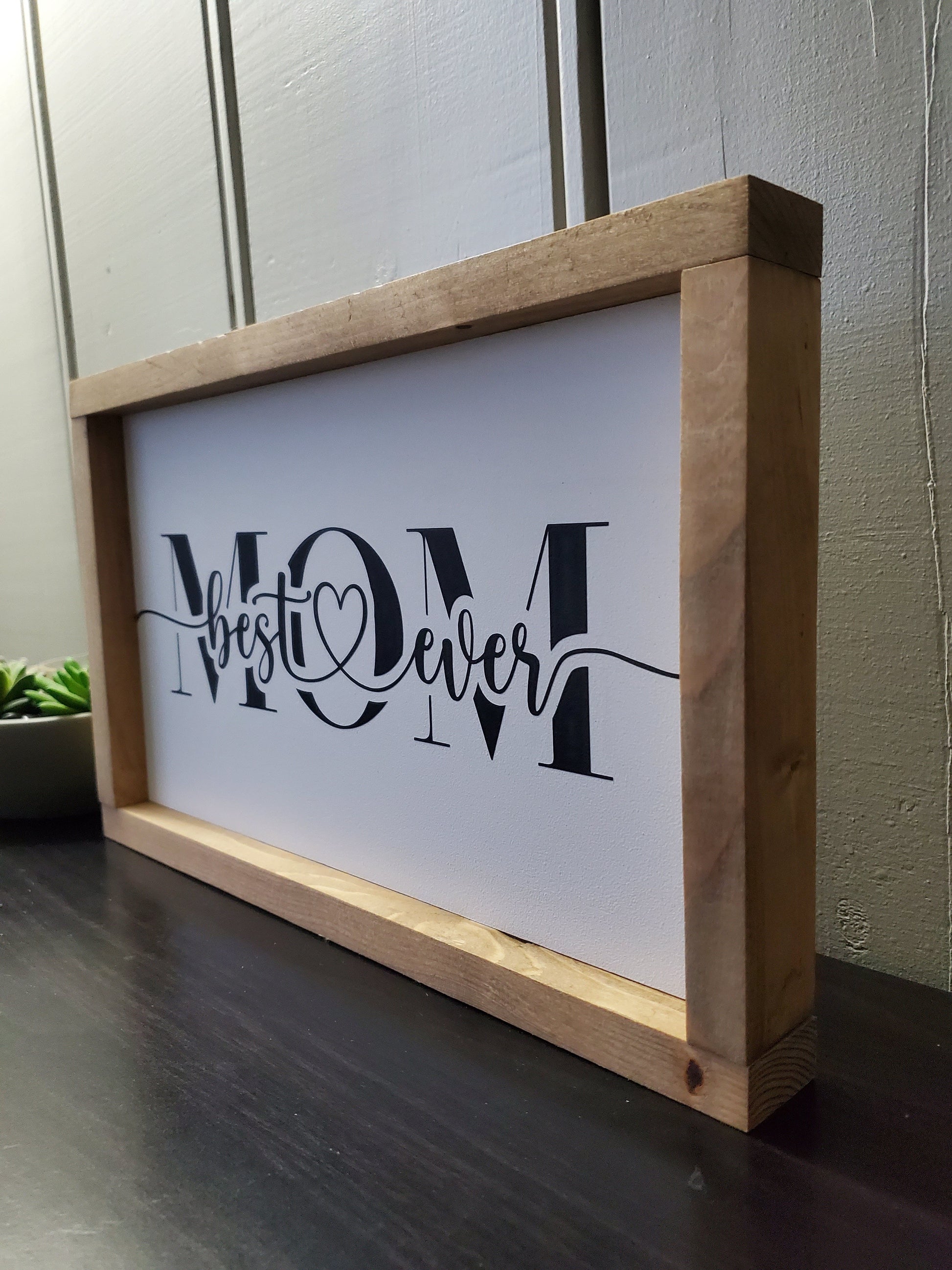 9.5" x 15.5" Mom -Best Mom Ever -Stained Special walnut. Sawtooth hanger on the back.