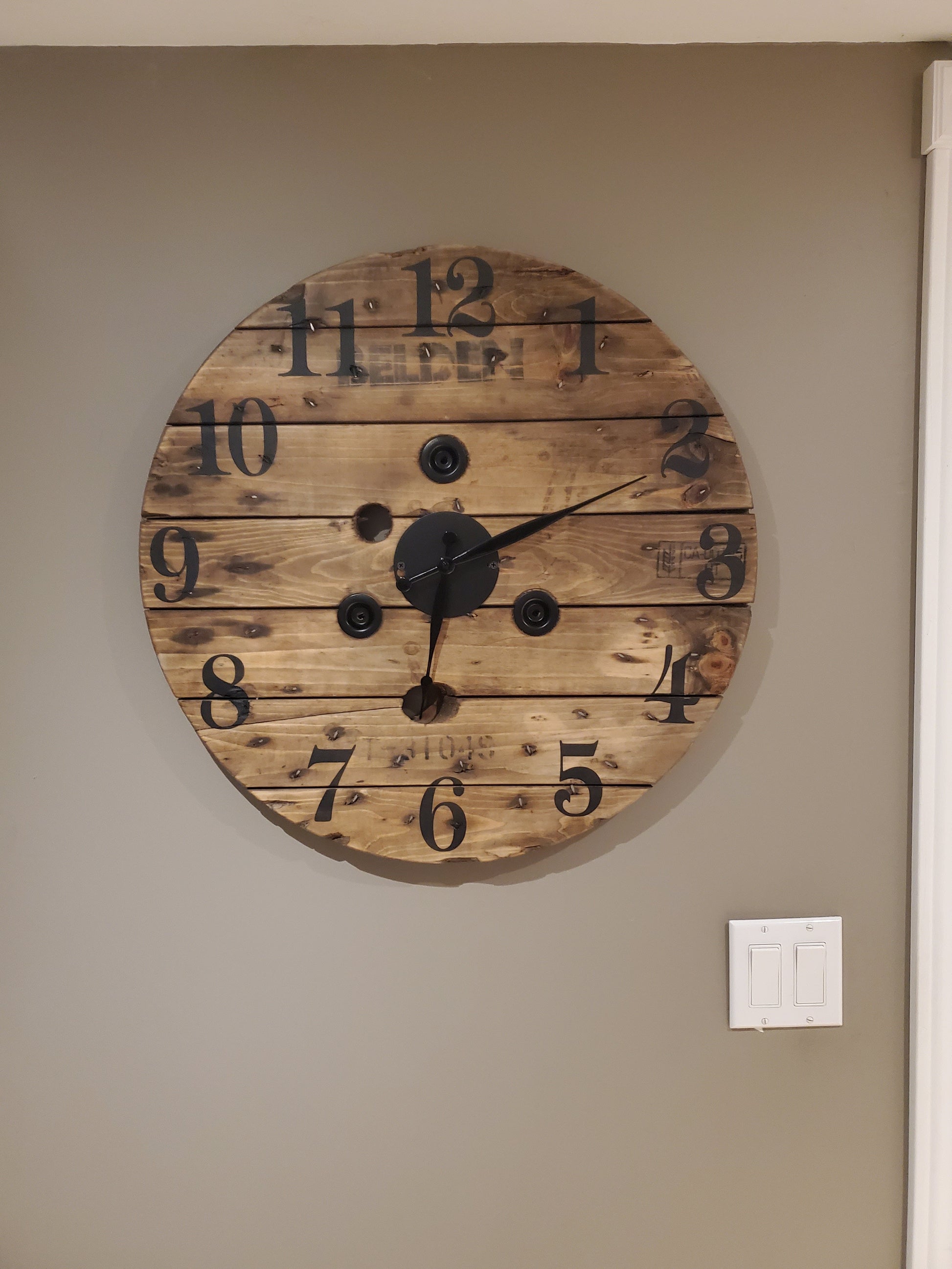 24" Rustic Indoor spool clock-stained walnut. Numbers are painted. Comes with a heavy duty sawtooth hanger on the back.