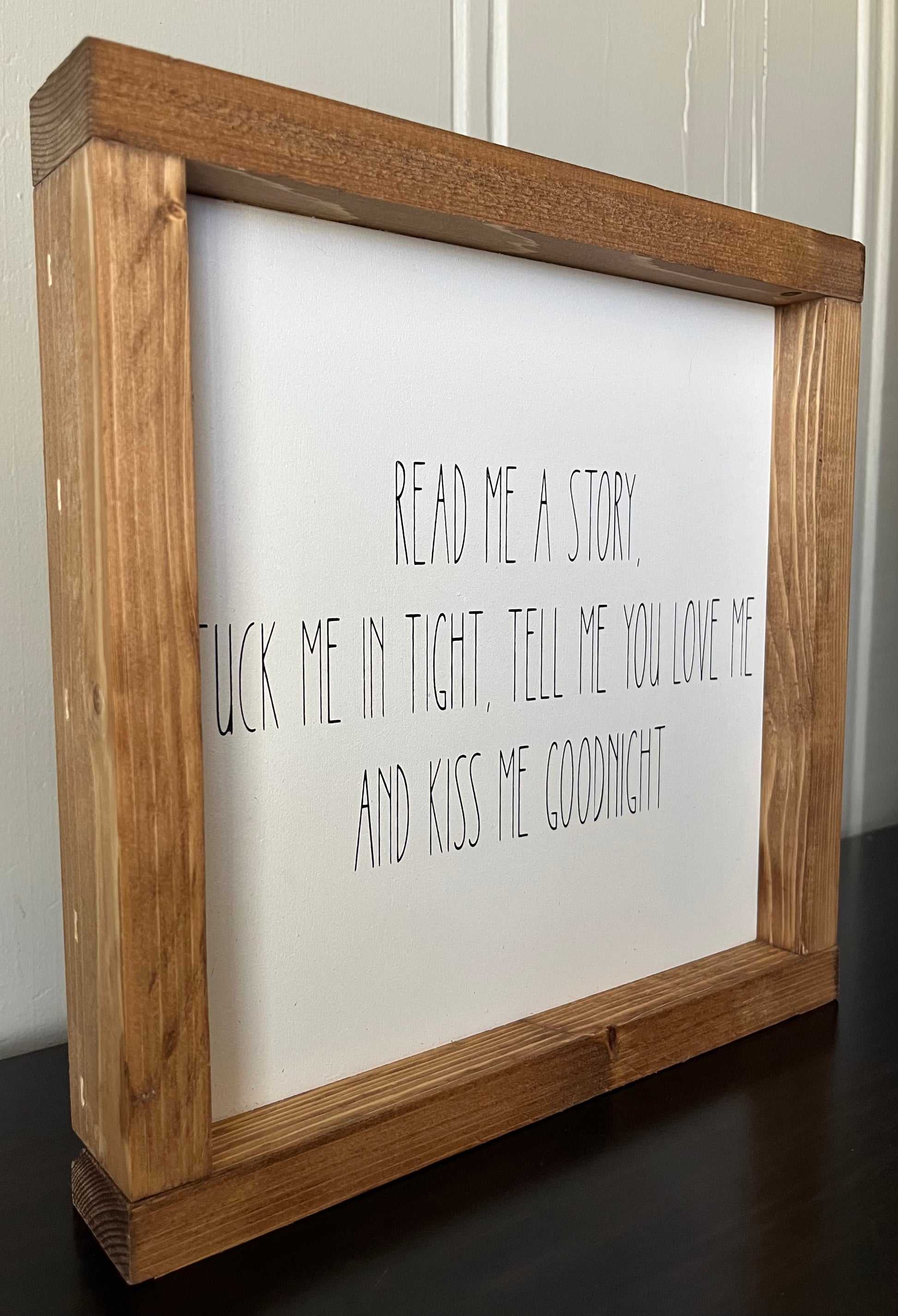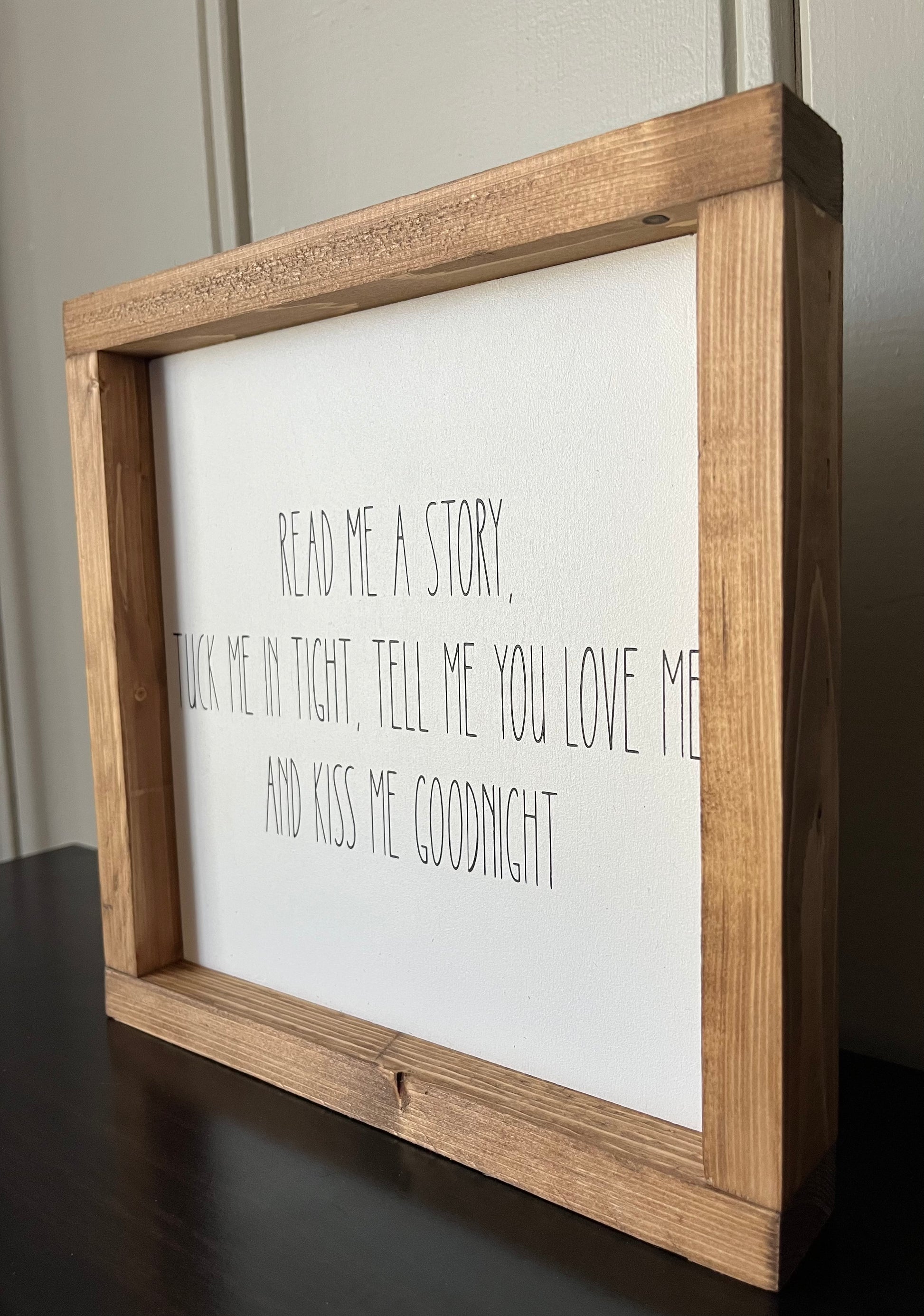 Get ready for bedtime with our handmade "Read Me a story, tuck me in tight" 10" sign. Hang it on your child's wall with the sawtooth hanger included and create a cozy reading nook. Get quality bonding time with your child as you read them a story every night.