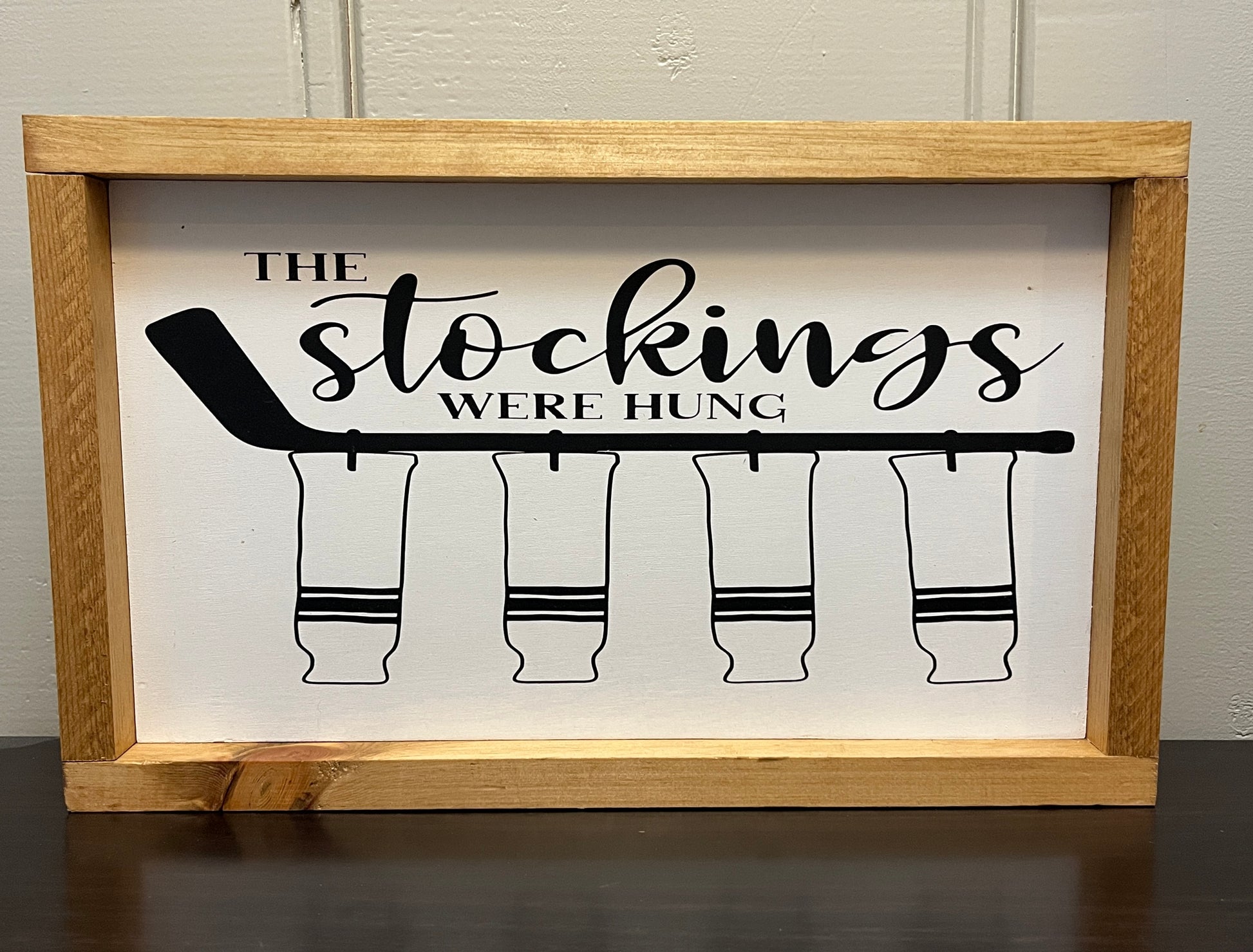 This Hockey Christmas sign features stockings that were hung, measuring 15.5" x 9.5". The wood is beautifully stained with an early American finish and comes with a convenient sawtooth hanger on the back.
