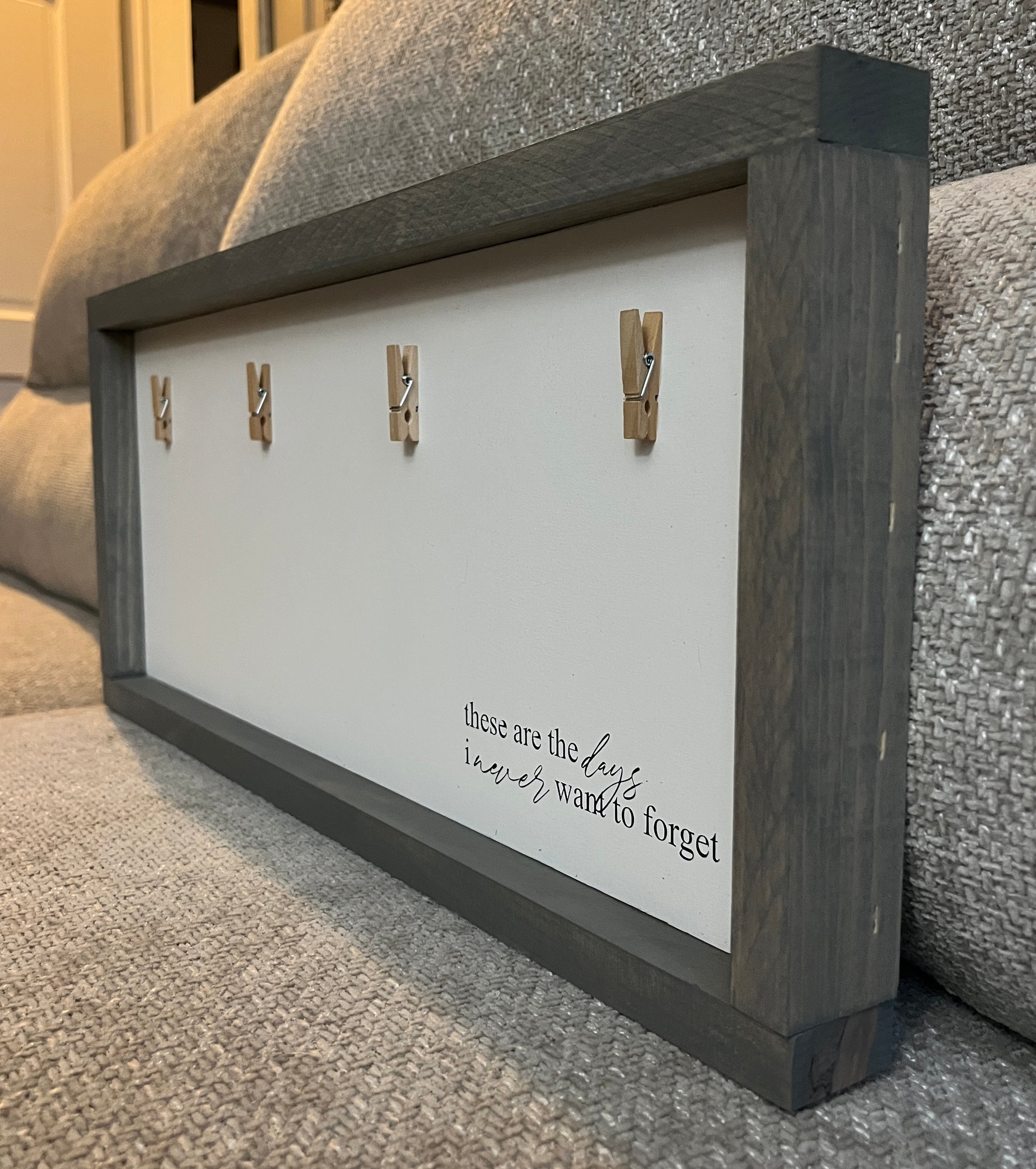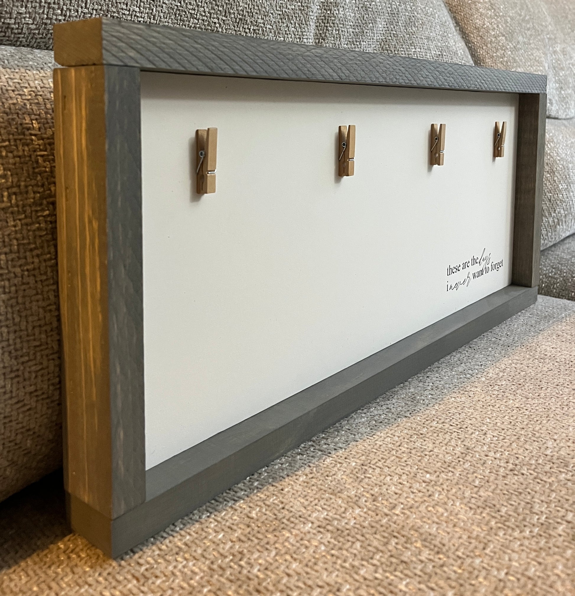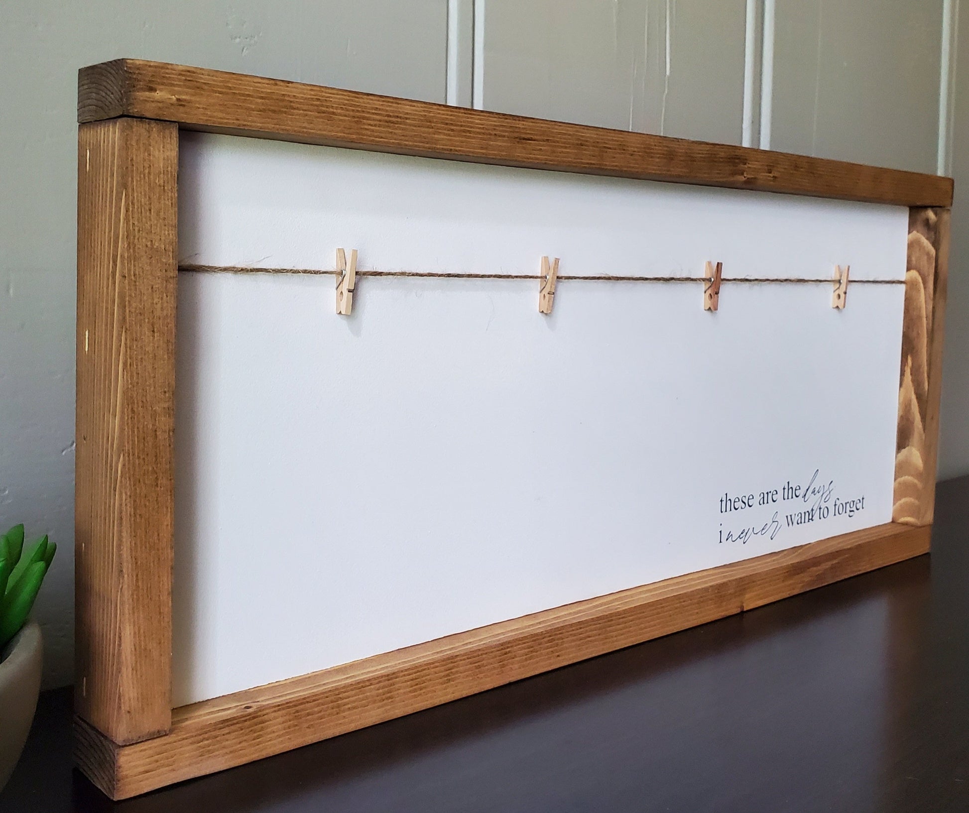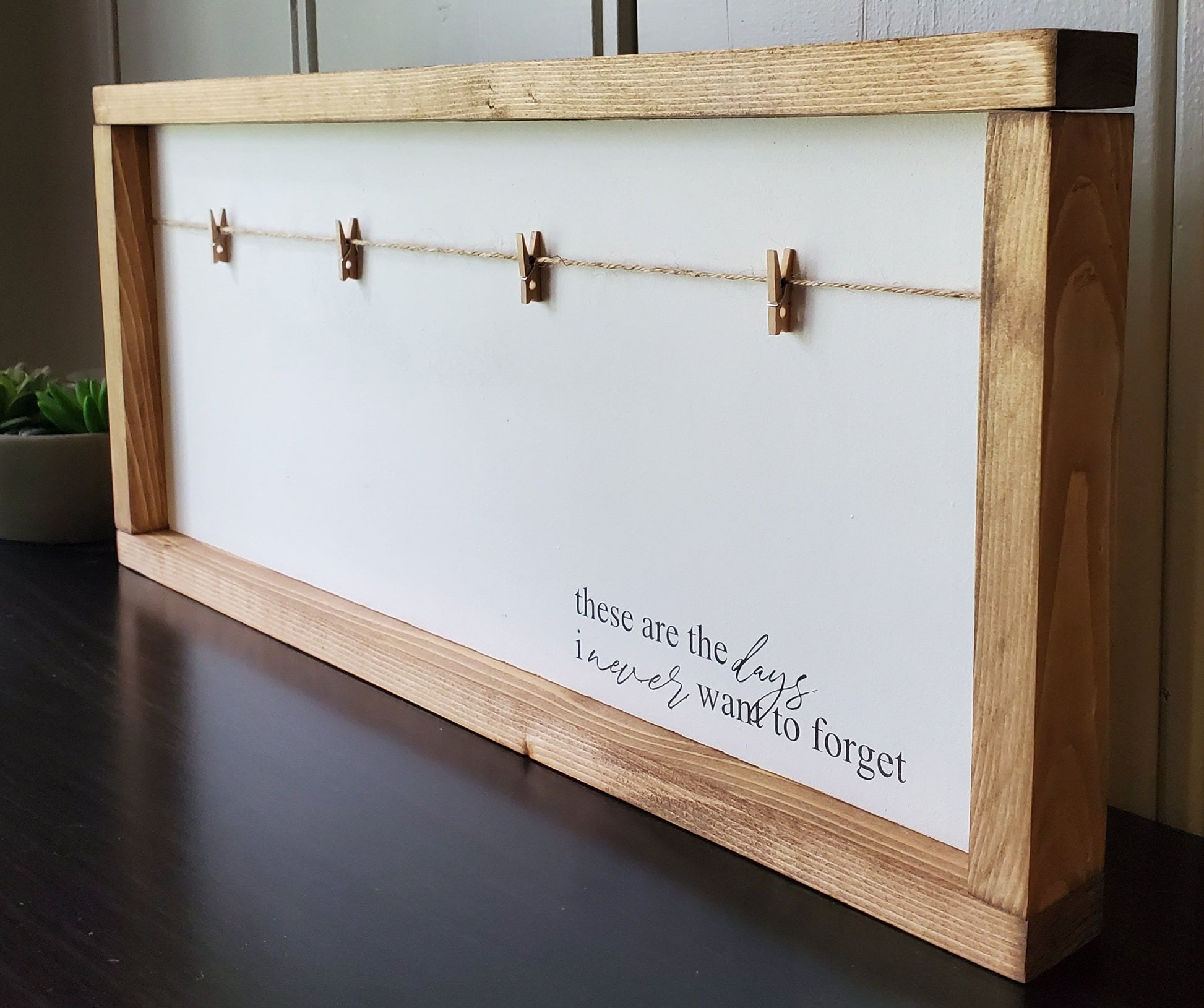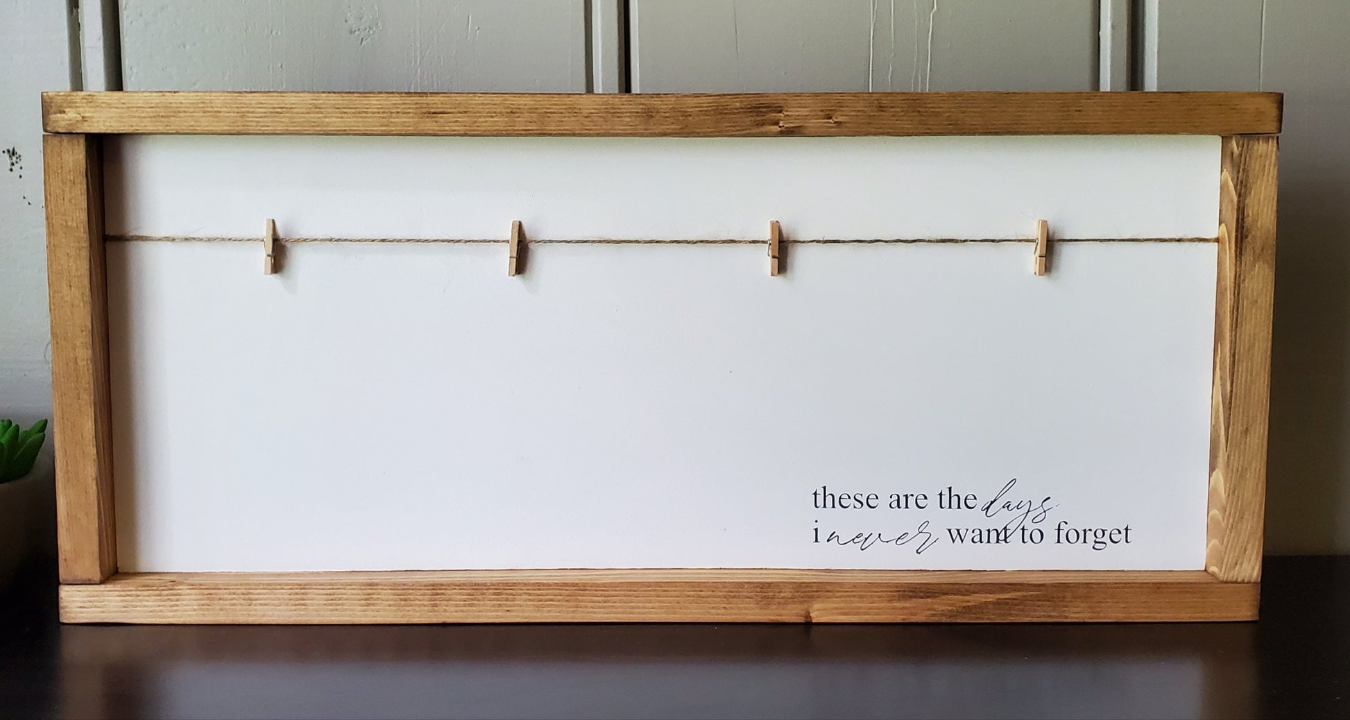 Introducing our exquisite handmade picture hanger, "These are the days I never want to forget." Crafted with care, this stained walnut beauty measures 9.5" x 21.5" and features mini pegs for securely displaying your cherished memories. With a convenient sawtooth hanger on the back, it's effortlessly ready to grace your walls. Ideal for showcasing your precious moments, this piece is designed to be unforgettable.