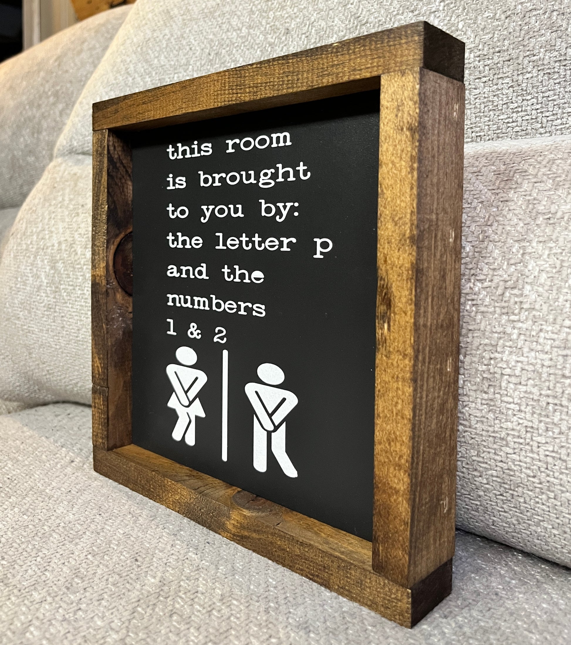 A playful bathroom sign featuring the letter P and numbers 1 & 2 in a 10" format. Perfect for adding humor to your powder room or guest bath. Includes a sawtooth hanger for easy wall mounting.