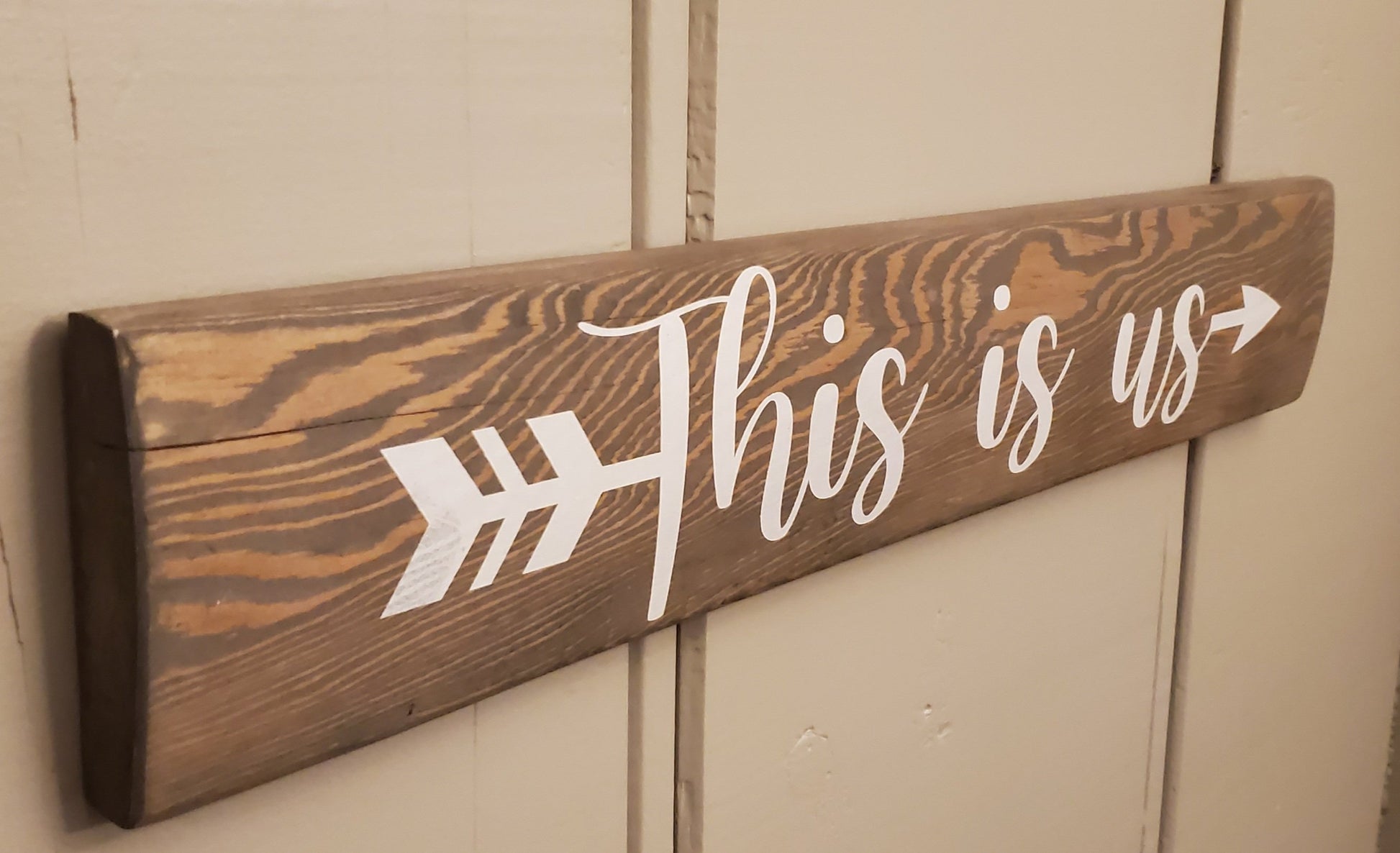 "This is us" arrow wood sign, stained classic gray 18.75" x 3.75" x 1/4" Painted letters. Comes with a sawtooth hanger on the back