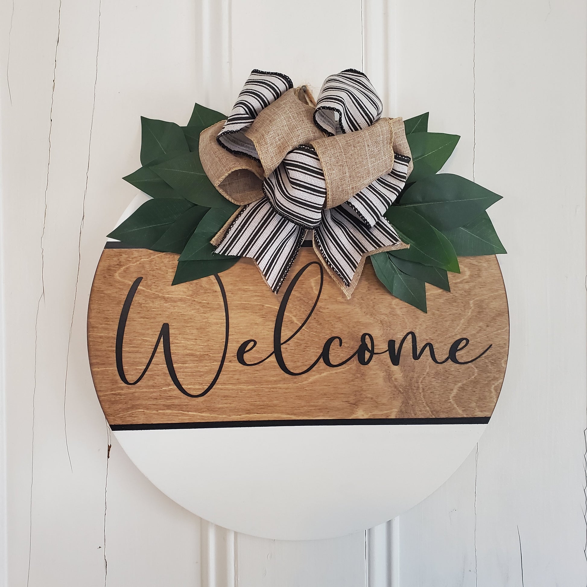 This 14" welcome door hanger features a sealed Special Walnut stain, perfect for outdoor use. Its durable design adds a warm and inviting touch to any entrance.