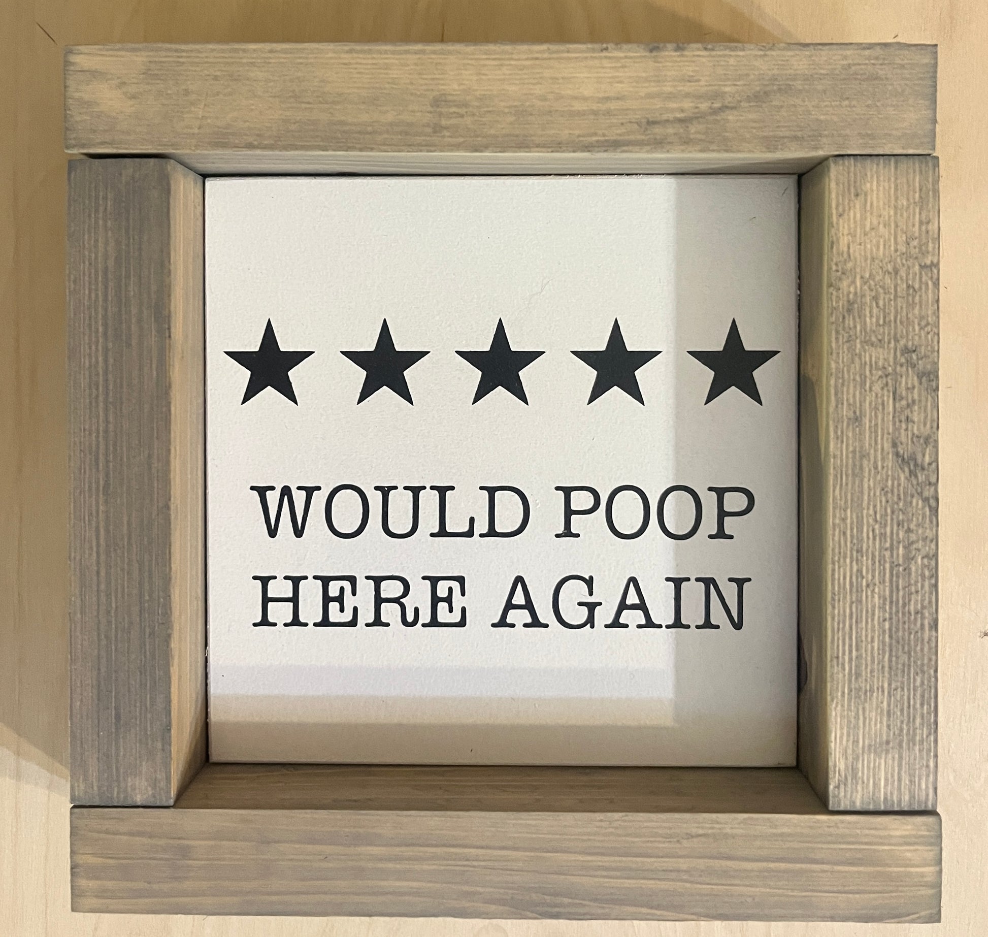 This 6x6" funny bathroom sign will have you laughing every time. With the clever phrase "Would poop here again," it adds a touch of humor to any bathroom. Don't think twice about bathroom breaks with this sign. Stained Special walnut.