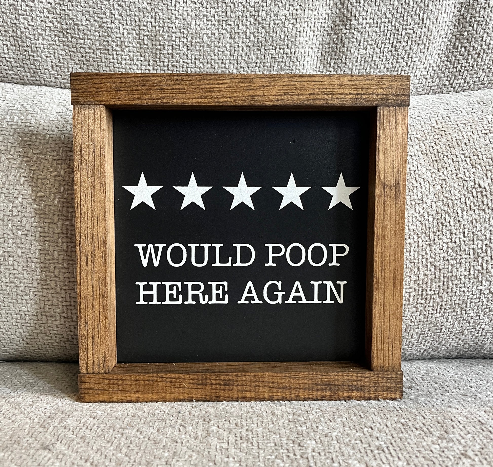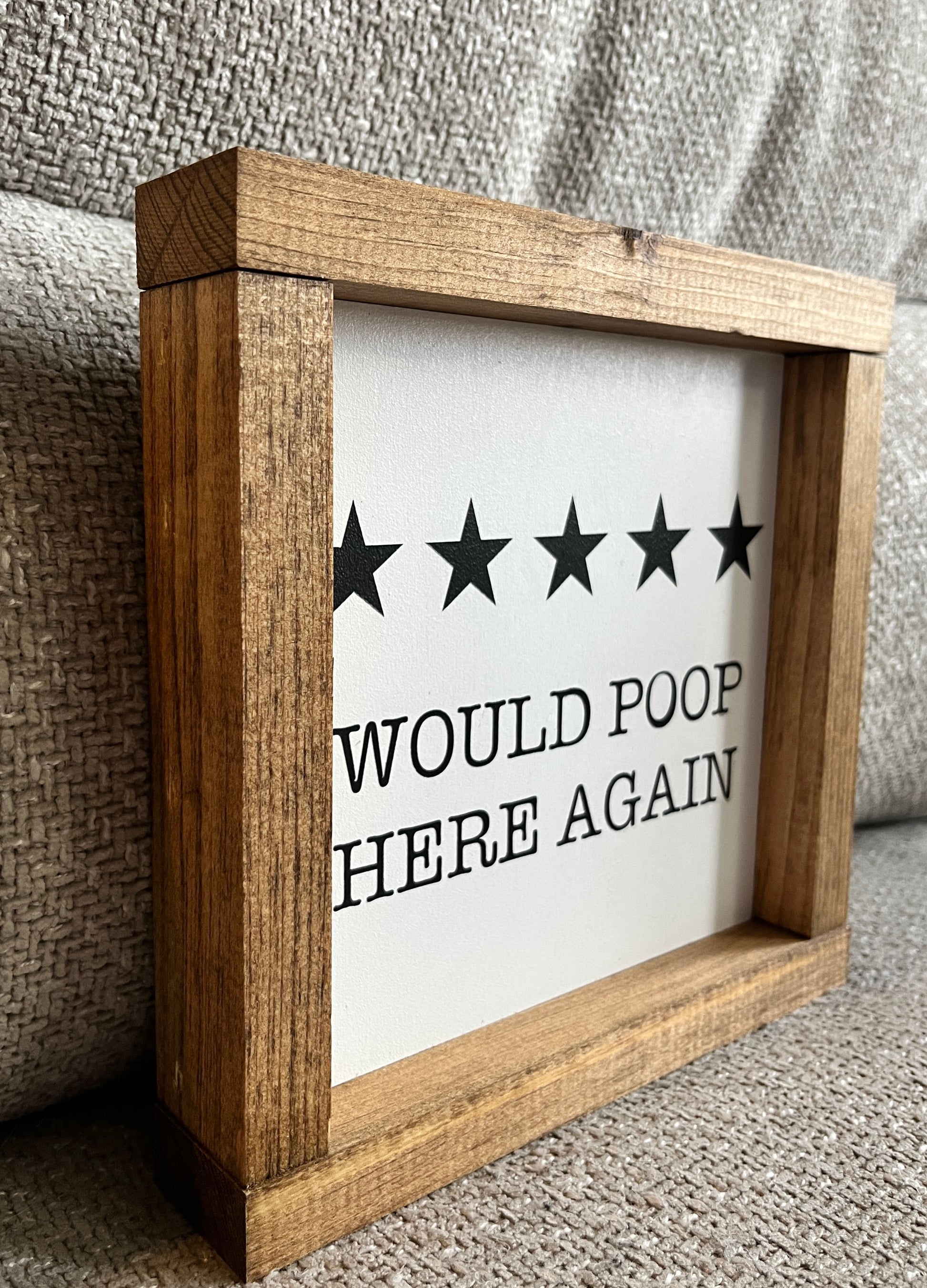 This 8x8" funny bathroom sign will have you laughing every time. With the clever phrase "Would poop here again," it adds a touch of humor to any bathroom. Don't think twice about bathroom breaks with this sign.