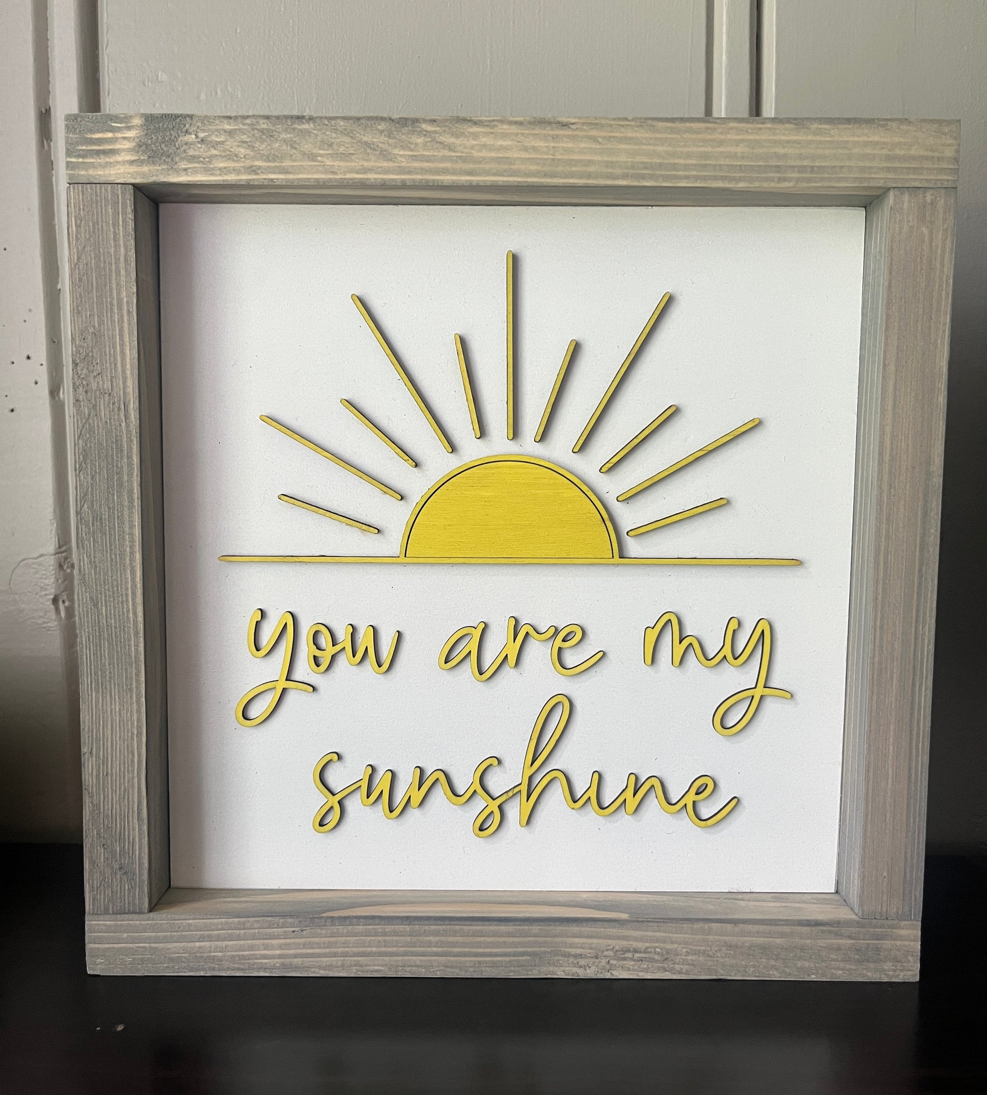 Brighten up your day with our 3D wood "You are my Sunshine" sign, measuring 10 inches. This sign adds a touch of charm to any space. Spread some sunshine with this playful and unique piece!